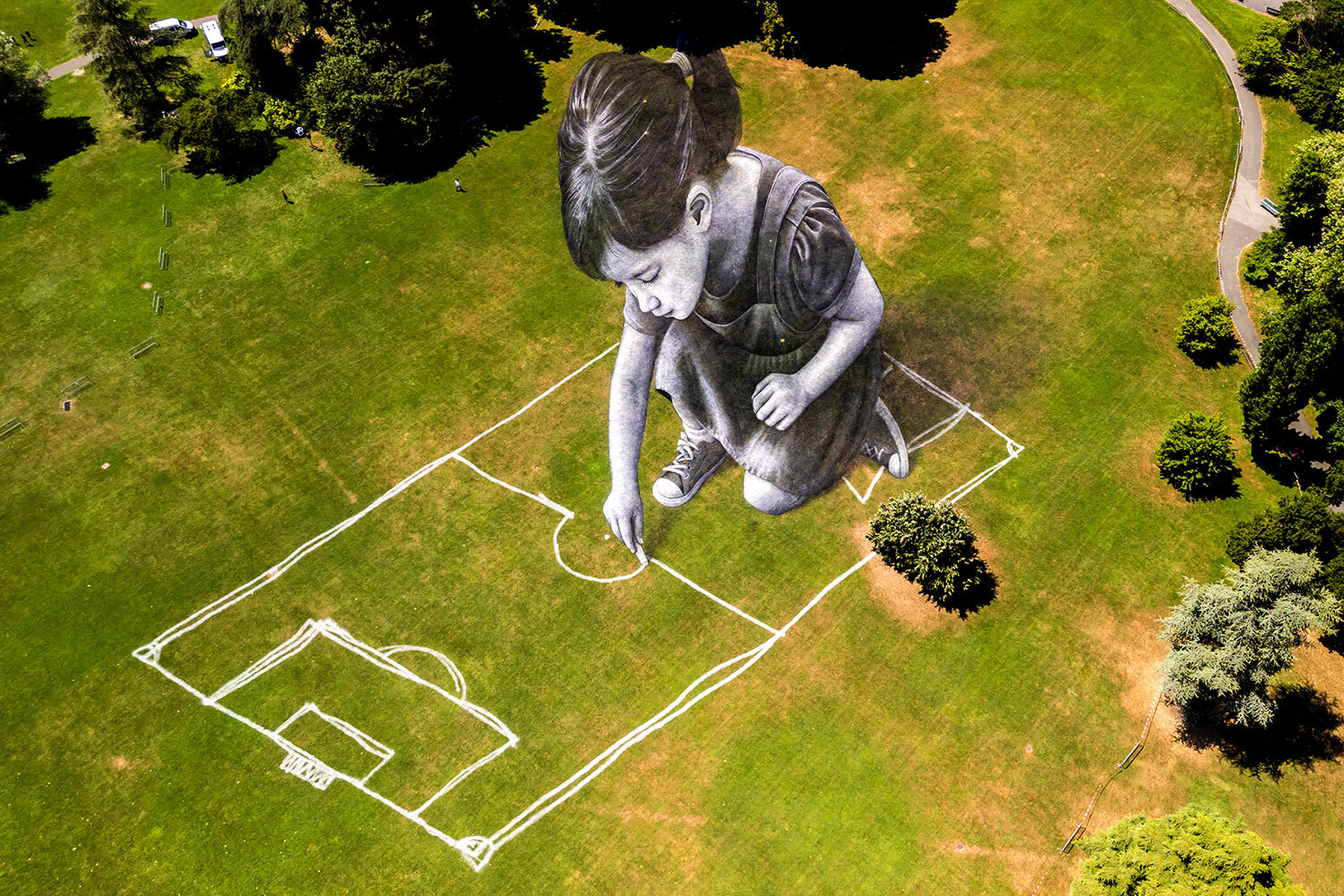 Биокартина «Поле возможностей» в Женеве, созданная художником Saype к чемпионату Европы по футболу среди женщин в Швейцарии.