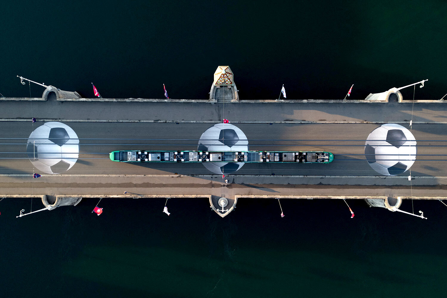 Гигантские футбольные мячи на мосту Митлер через реку Рейн в преддверии женского чемпионата Европы по футболу в Базеле, Швейцария.
