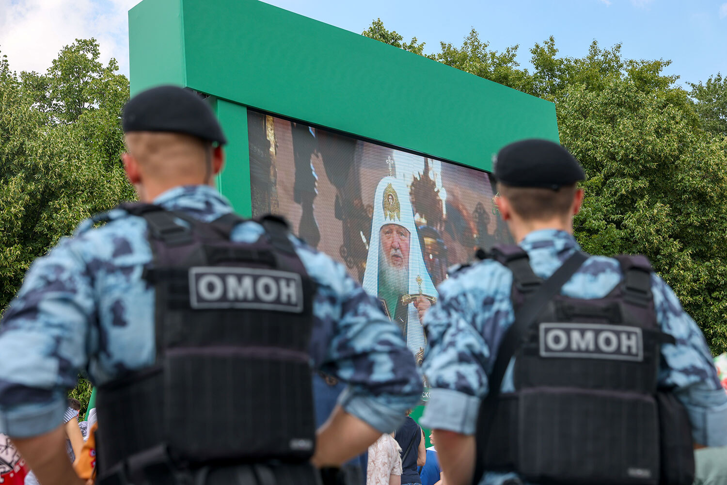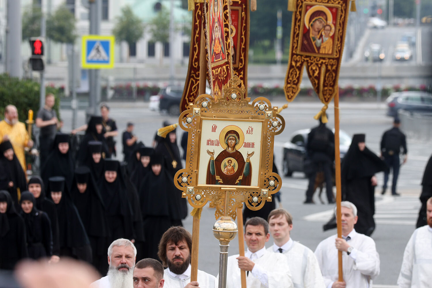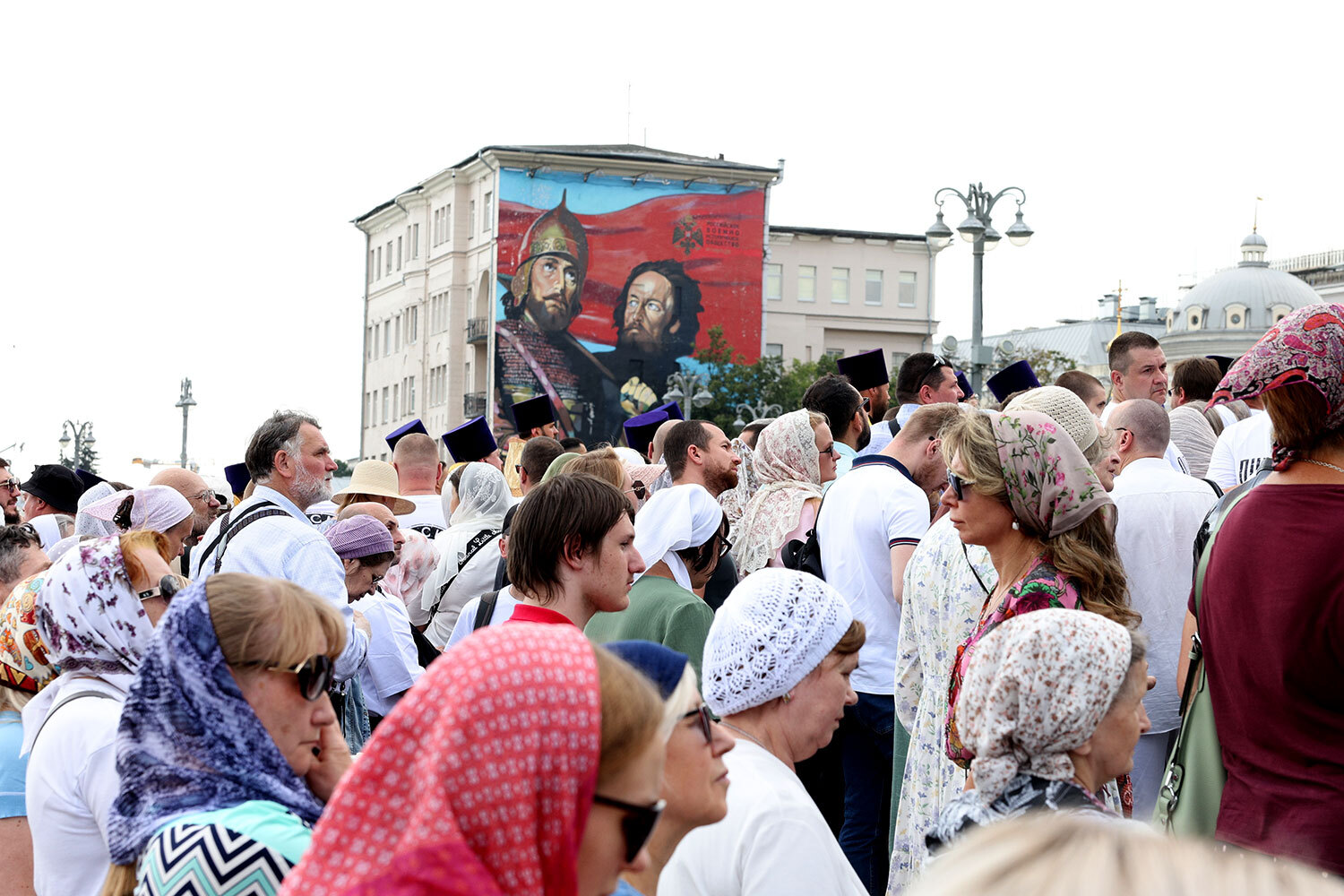 На фото: верующие на фоне граффити с портретами Минина и Пожарского, которое, как и памятник, создали при участии Российского военно-исторического общества.