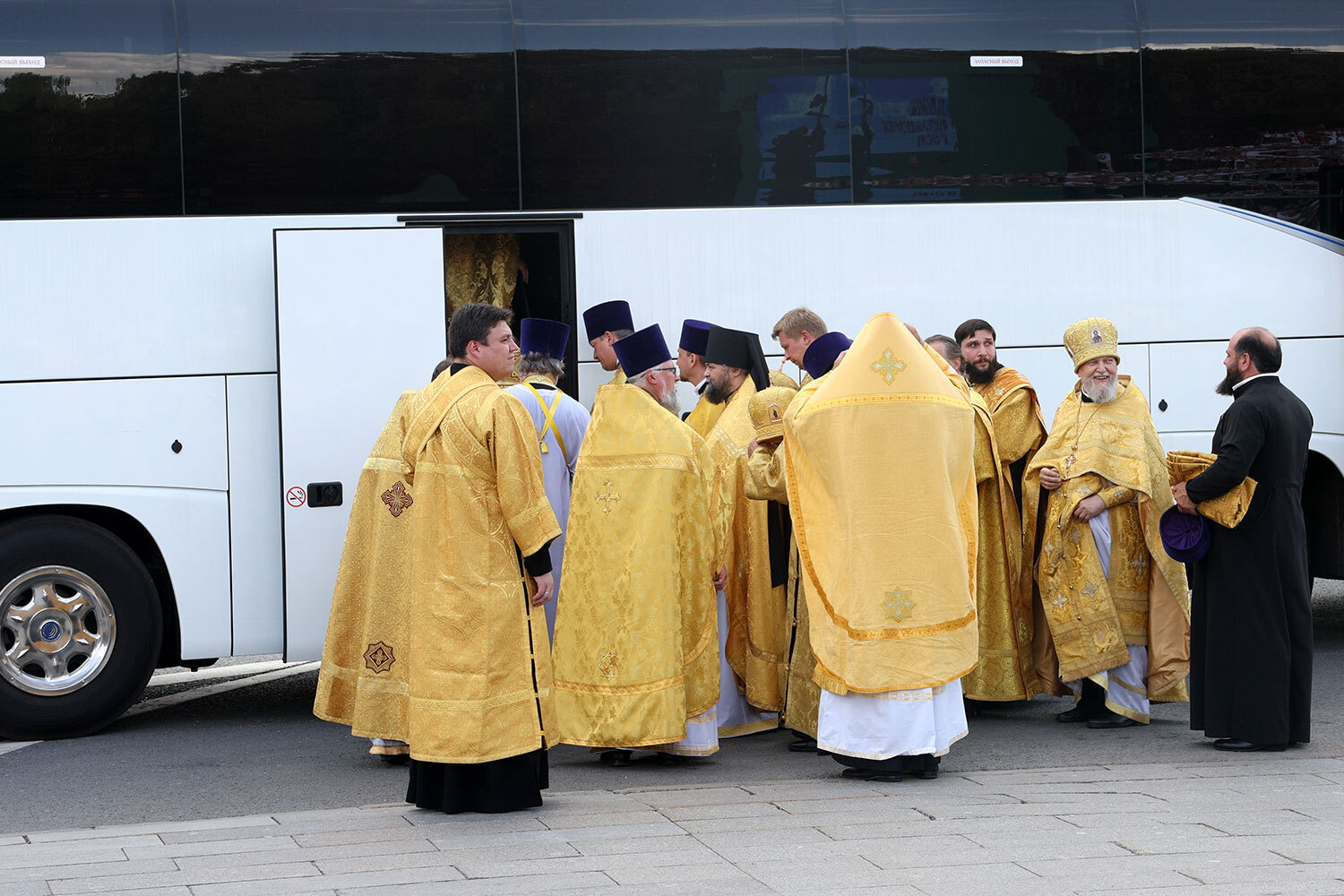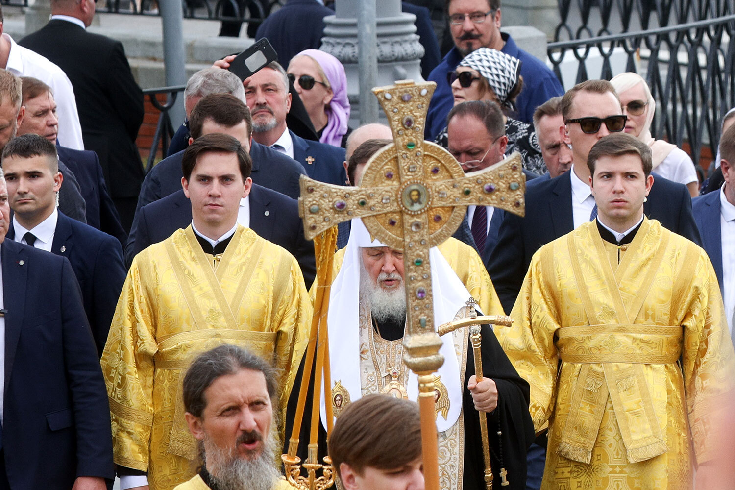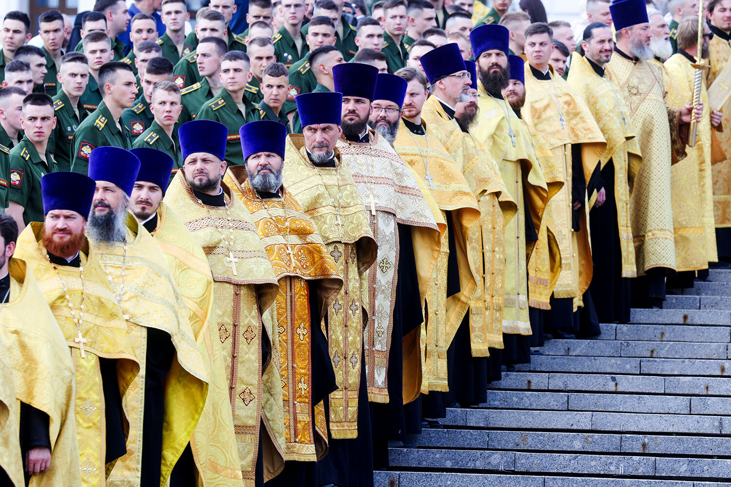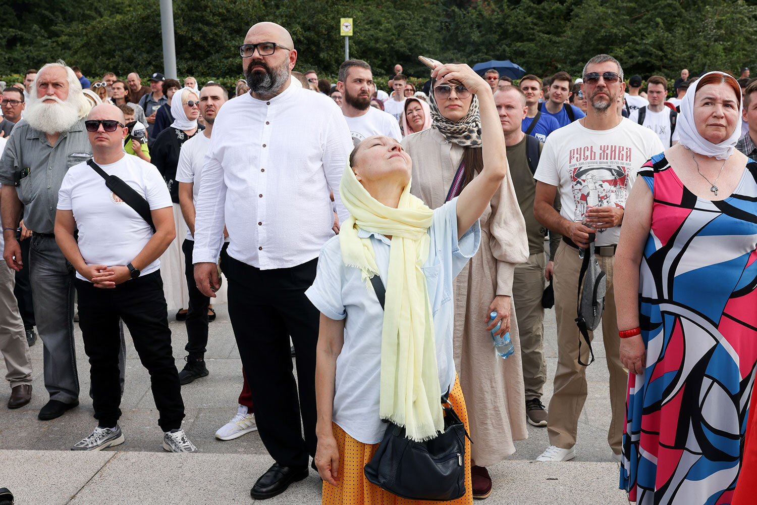 На фото: верующие на фоне граффити с портретами Минина и Пожарского, которое, как и памятник, создали при участии Российского военно-исторического общества.