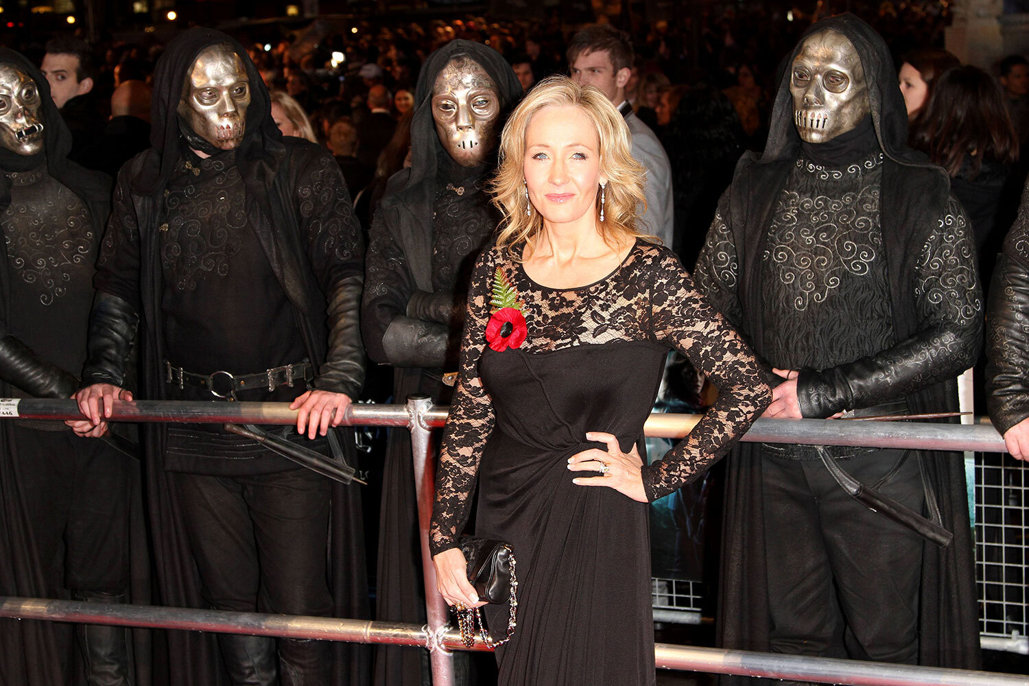 На фото: писательница рядом с людьми в костюмах пожирателей смерти.