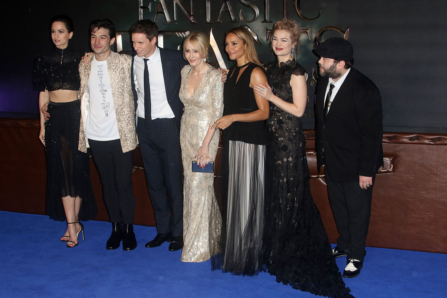 На фото: писательница Джоан Роулинг (в центре) с актерами и создателями серии фильмов «Фантастические твари».