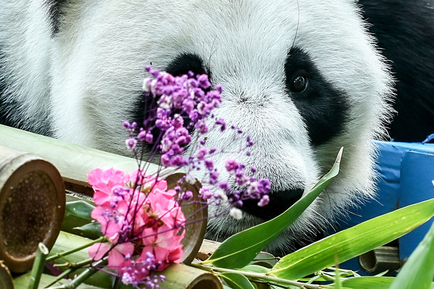 30 июля 2025 г. Панда Диндин с угощением в Московском зоопарке.