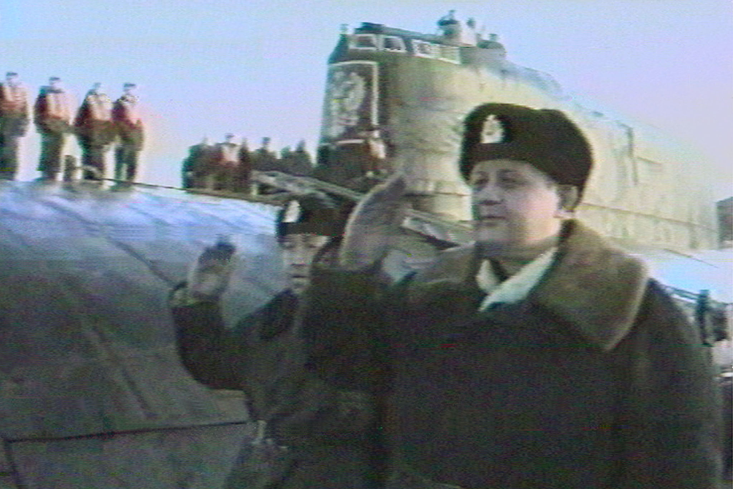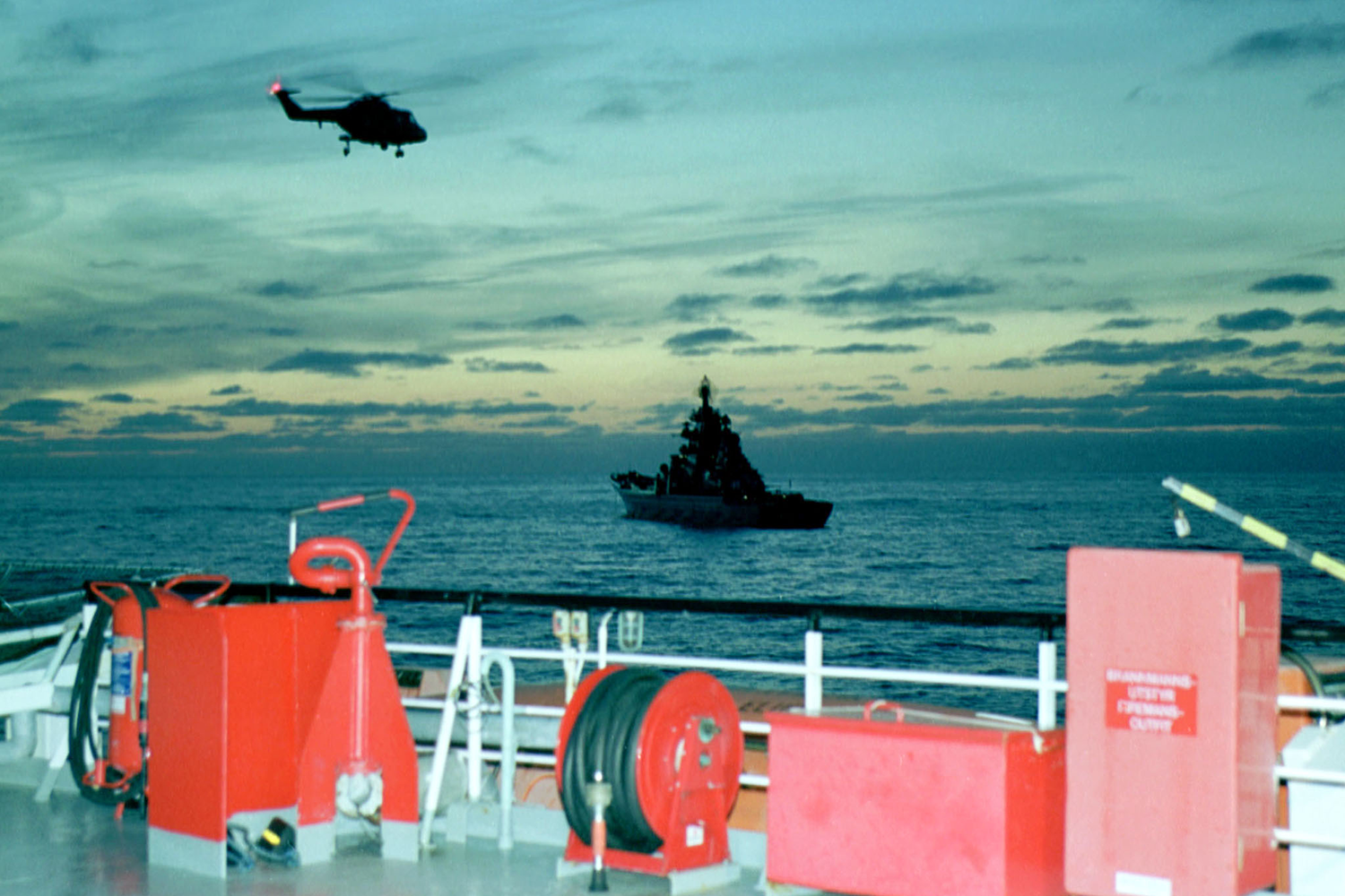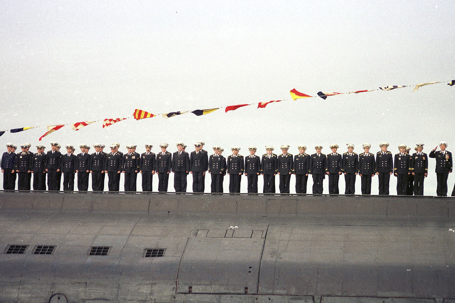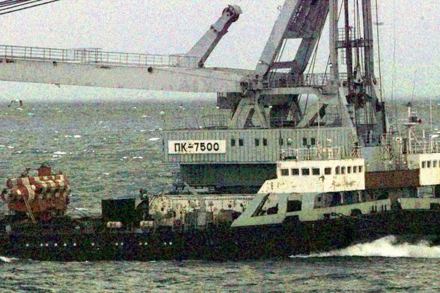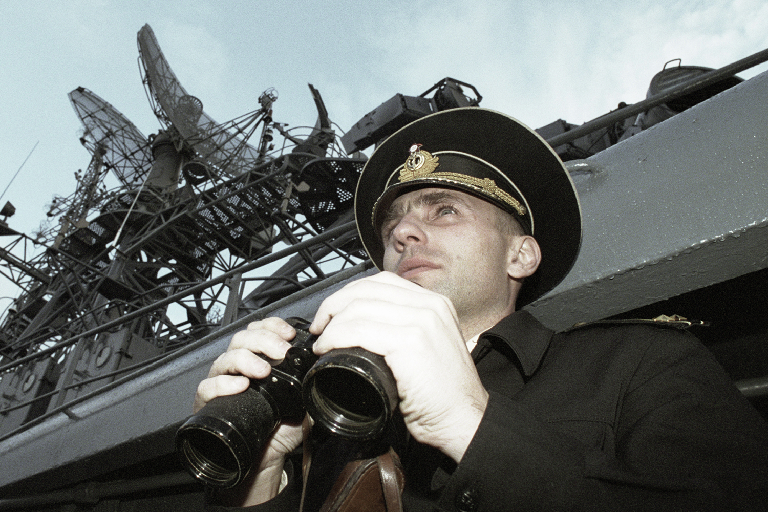 На фото: морской офицер корабля Северного флота наблюдает в бинокль за зоной подъема атомной подводной лодки «Курск».