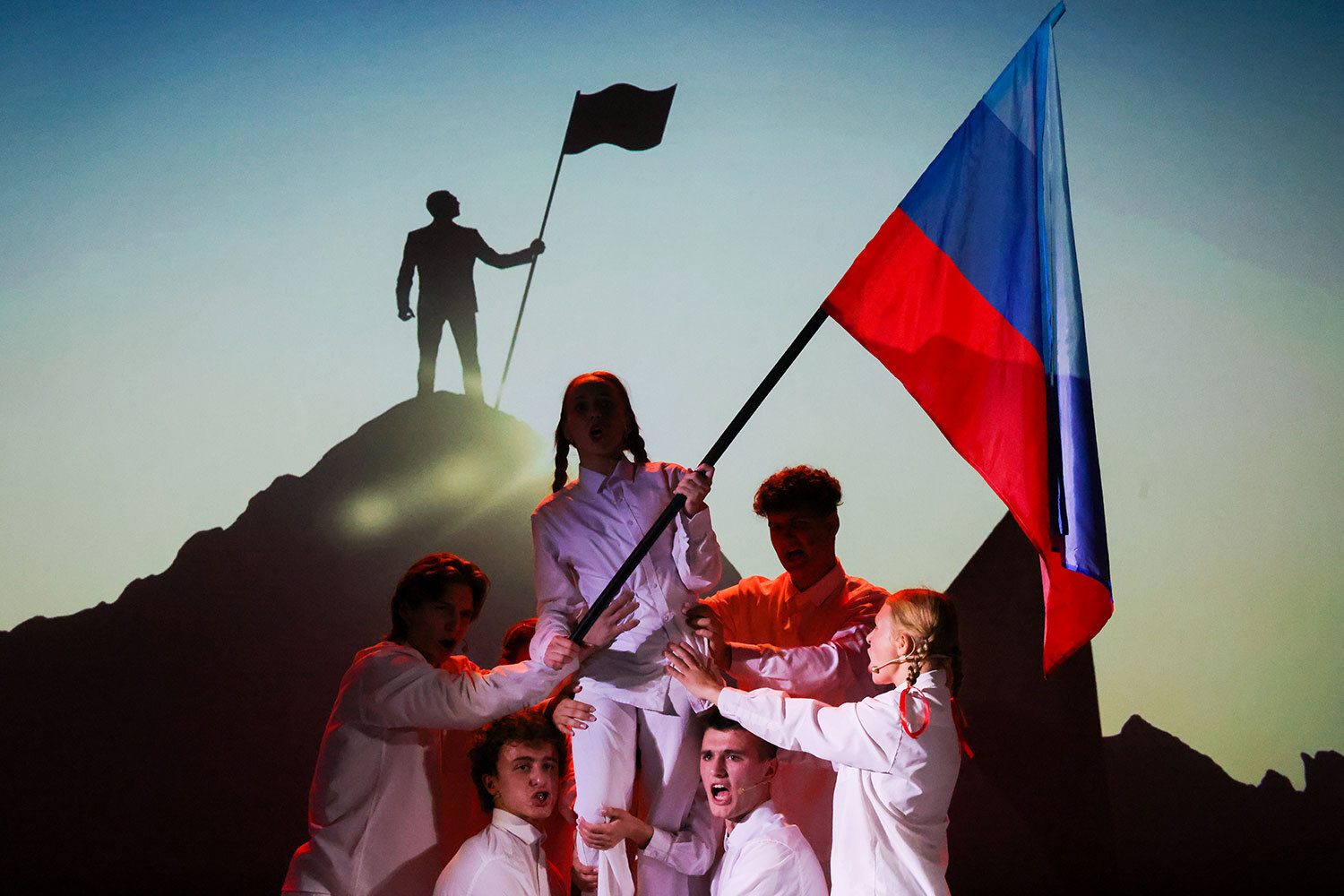 На фото: артисты Луганского народного студенческого театра «25 кадр» во время спектакля режиссера Ольги Куриловой «Наша молодая гвардия», приуроченного ко Дню воссоединения, в киноконцертном зале «Жуков» в Музее Победы.