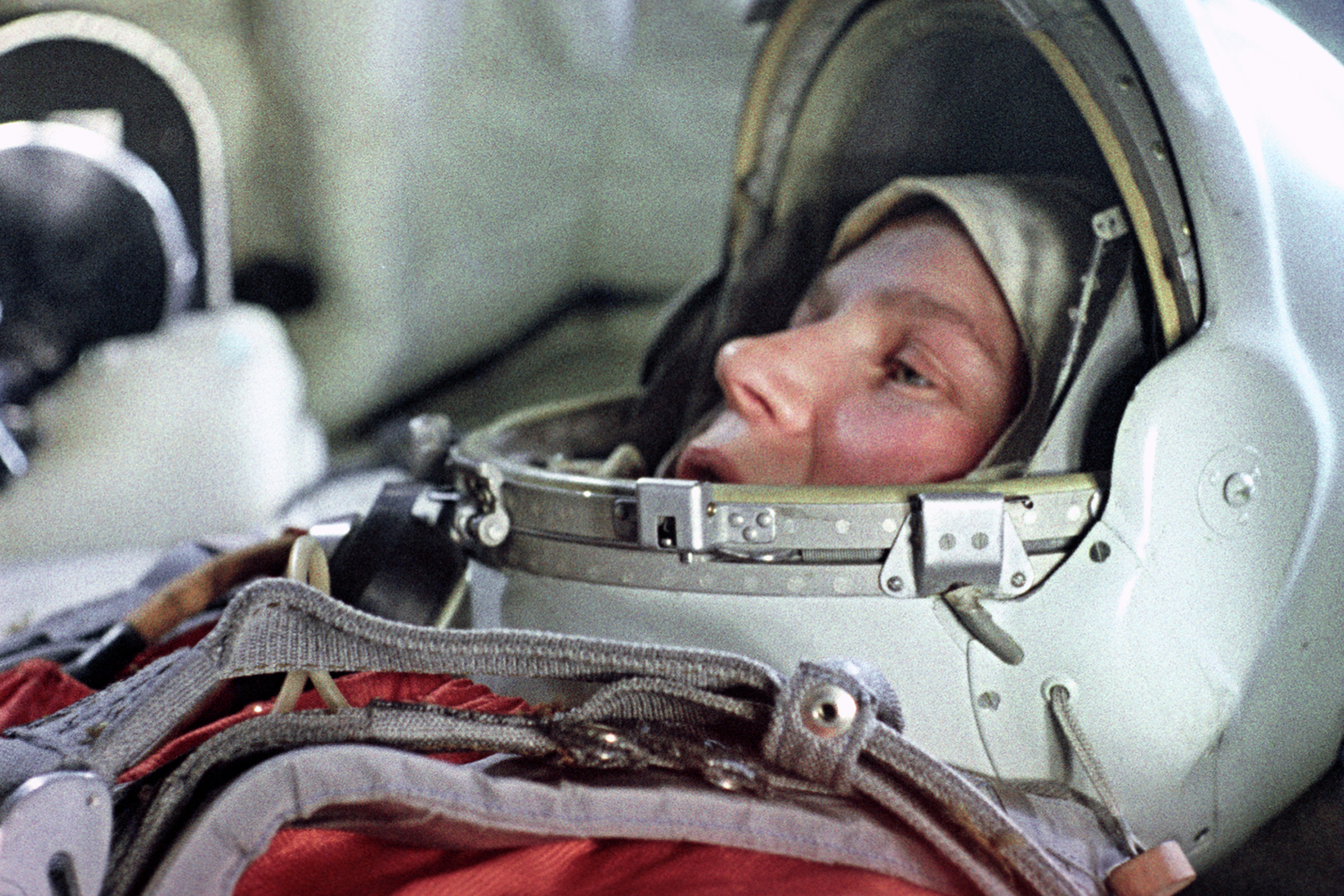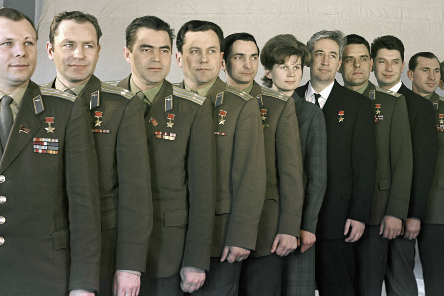 На фото слева направо: космонавты Юрий Гагарин, Герман Титов, Андриян Николаев, Павел Попович, Валерий Быковский, Валентина Николаева-Терешкова, Константин Феоктистов, Владимир Комаров, Борис Егоров и Павел Беляев.