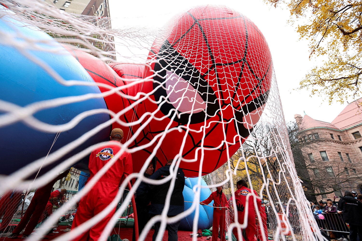 Воздушный шар в форме Человека-паука надувают накануне парада Macy's в честь Дня благодарения на Манхэттене в Нью-Йорке, США.