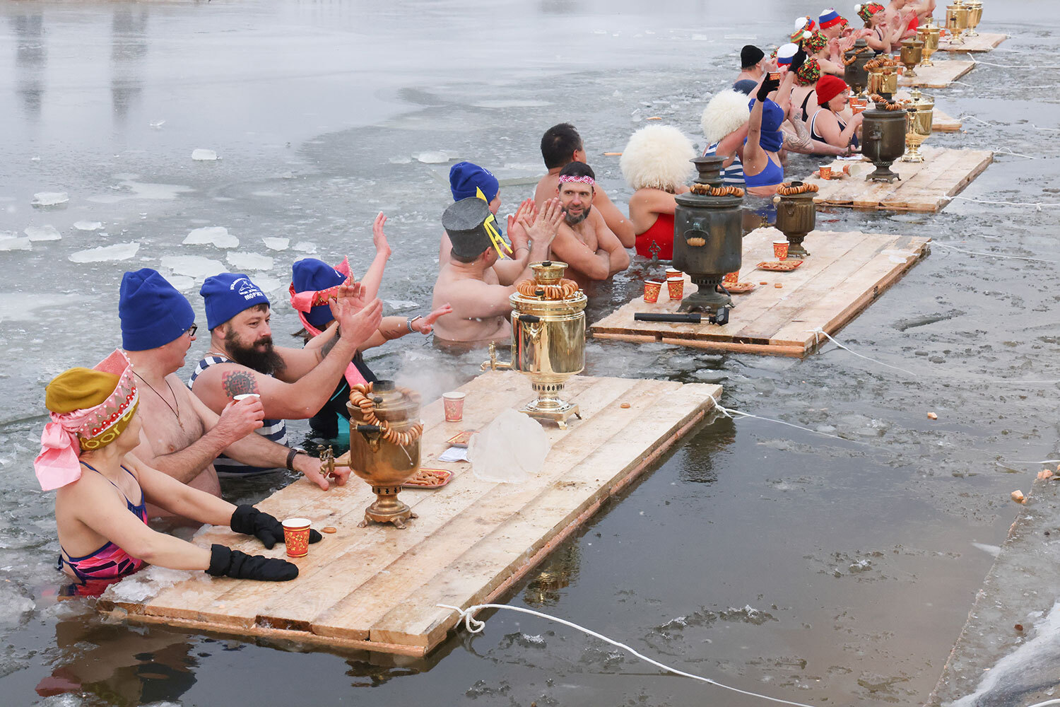 14 декабря 2025 г. Купальщики во время установления рекорда России «Самое массовое чаепитие в проруби» в Калужской области.