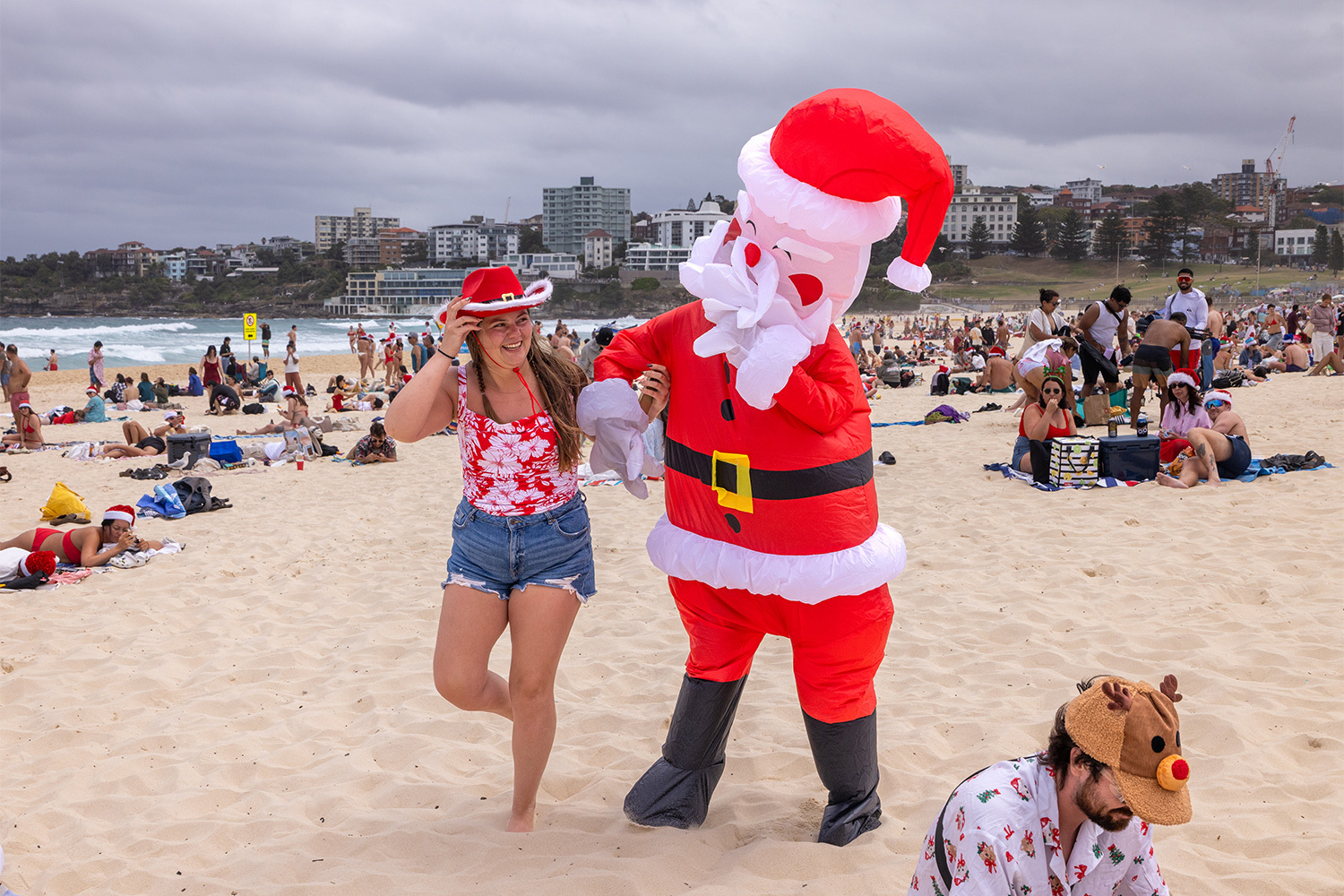 Надувной Санта-Клаус на пляже в Сиднее, Австралия.