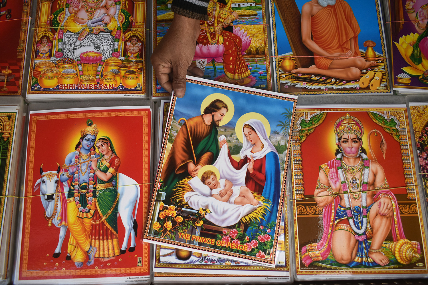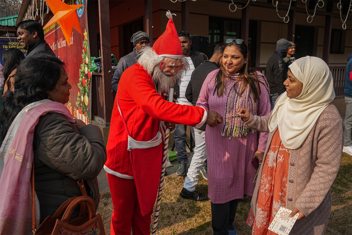 Переодетый Санта-Клаусом юноша раздает сладости прихожанам церкви Святого Семейства в Сринагаре, Джамму и Кашмир.