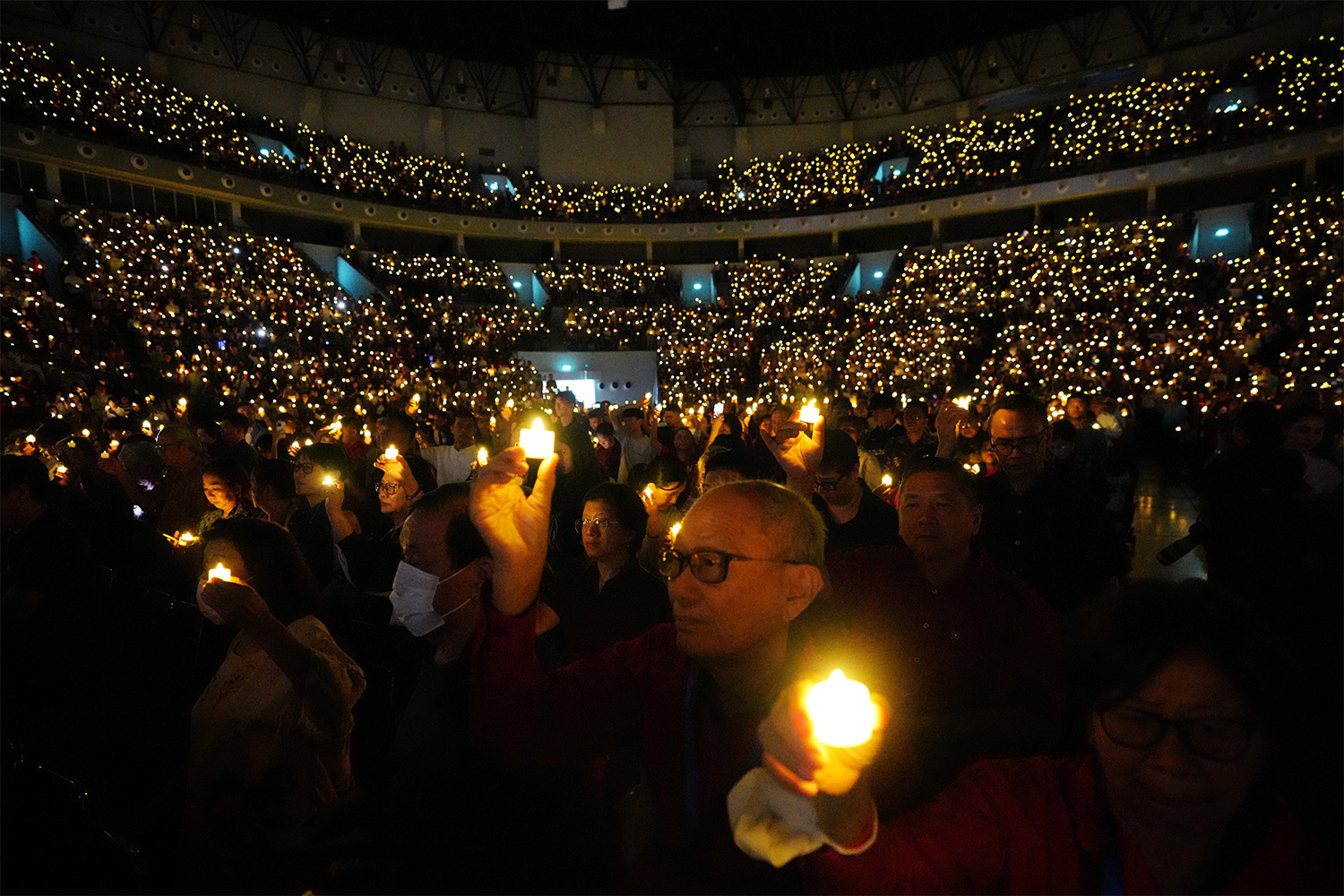 Верующие зажгли электрические свечи в канун Рождества на стадионе Indonesia Arena в Джакарте, Индонезия.