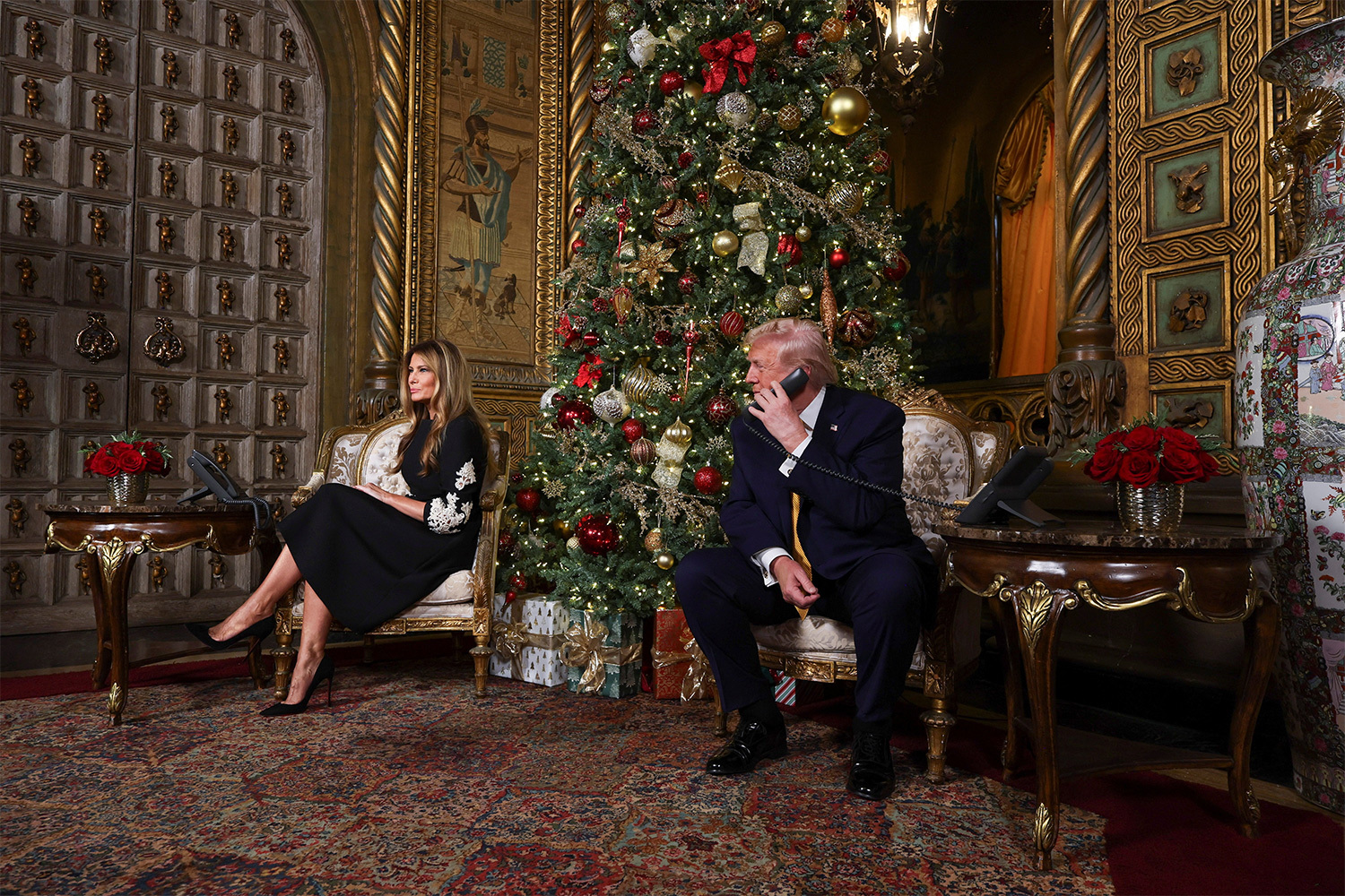Президент США Дональд Трамп и первая леди страны Мелания Трамп принимают звонки для Санта-Клауса в резиденции Мар-а-Лаго в Палм-Бич, США.