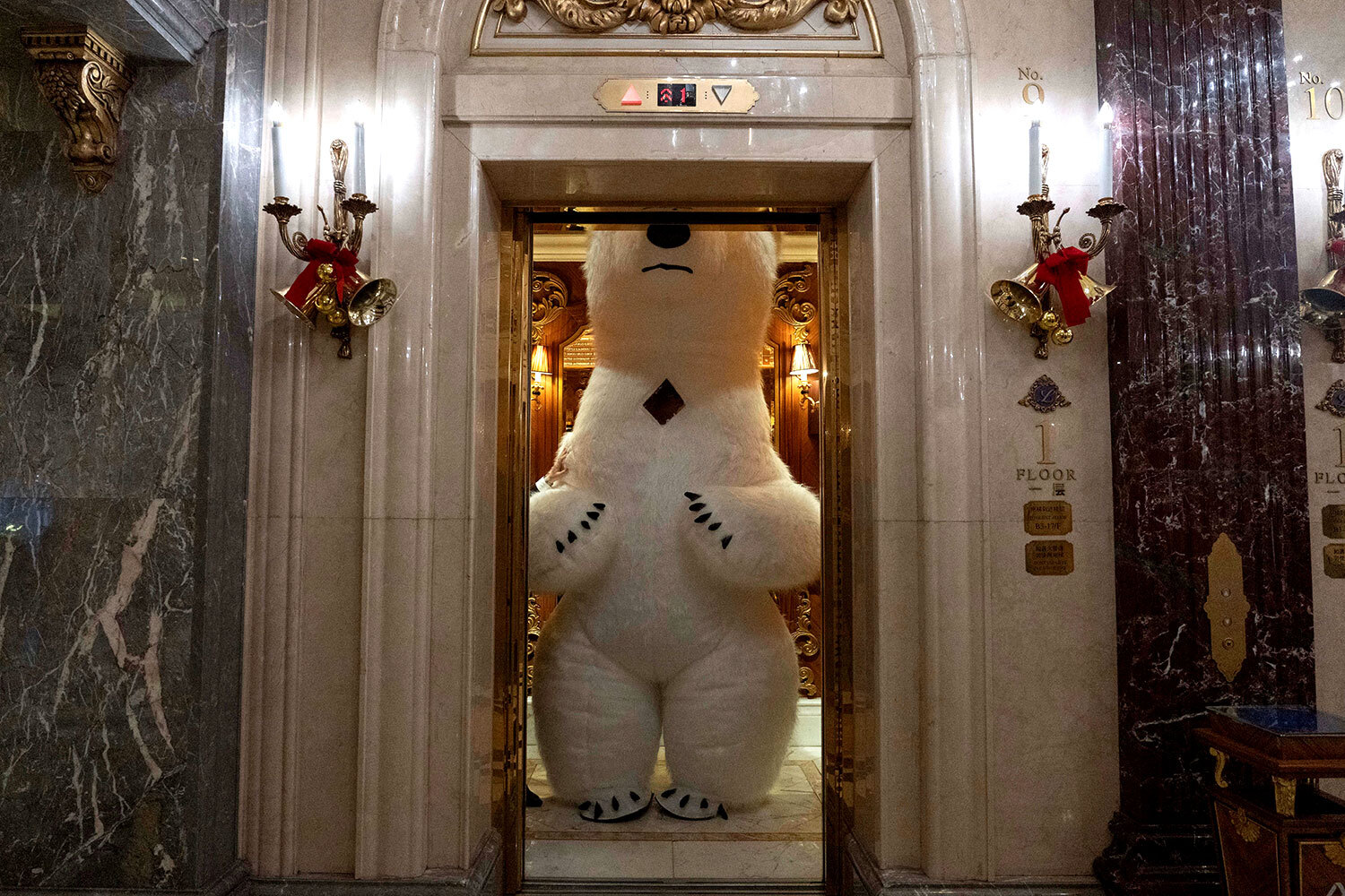 24 декабря 2025 г. Талисман в виде белого медведя в лифте, Пекин, Китай.
