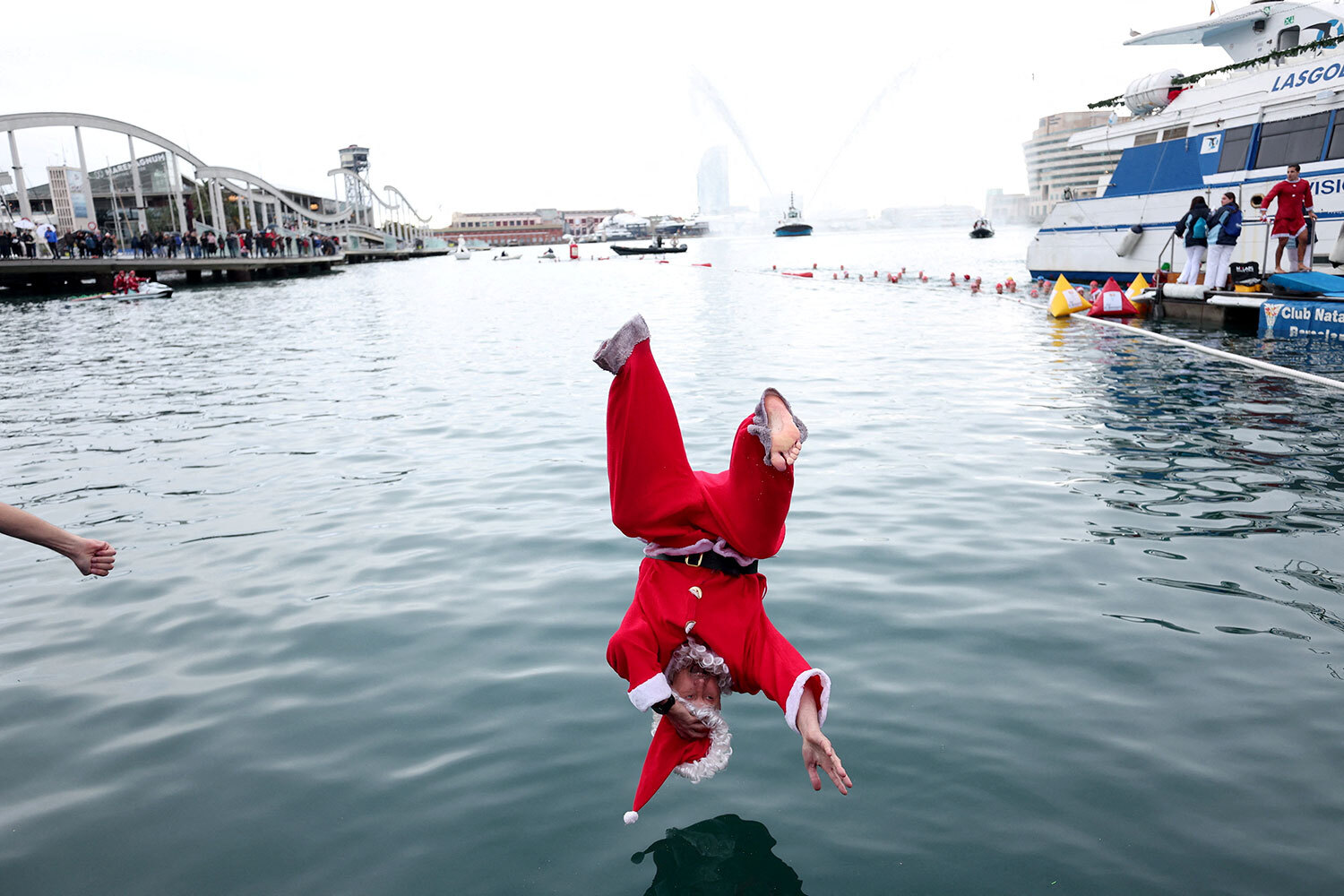25 декабря 2025 г. Участник в костюме Санта-Клауса прыгает в Средиземное море во время соревнований по плаванию Кубка Надаля (Рождественский кубок) в Барселоне, Испания.