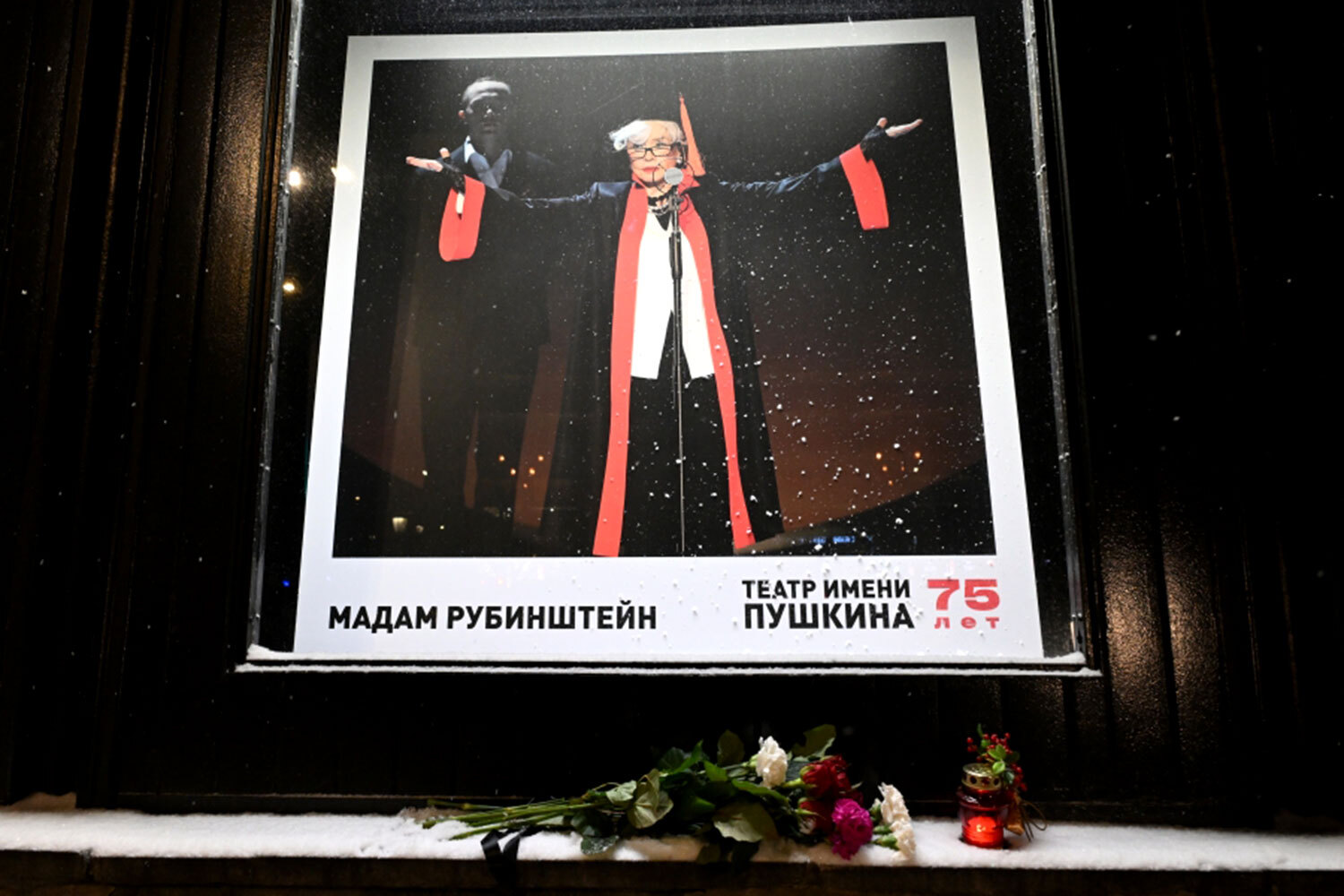 25 декабря 2025 г. Цветы у афиши спектакля «Мадам Рубинштейн» в Театре им. Пушкина.