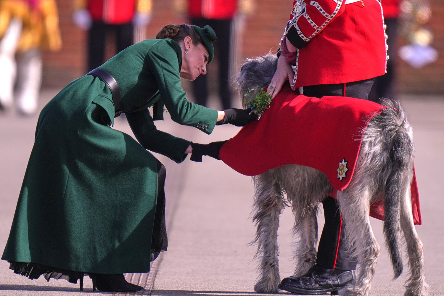 17 марта 2026 г. Принцесса Кейт Уэльская приняла участие в параде в честь Дня Святого Патрика в казармах Монс и вручила традиционные веточки клевера талисману полка ирландскому волкодаву Шеймусу в Олдершоте.