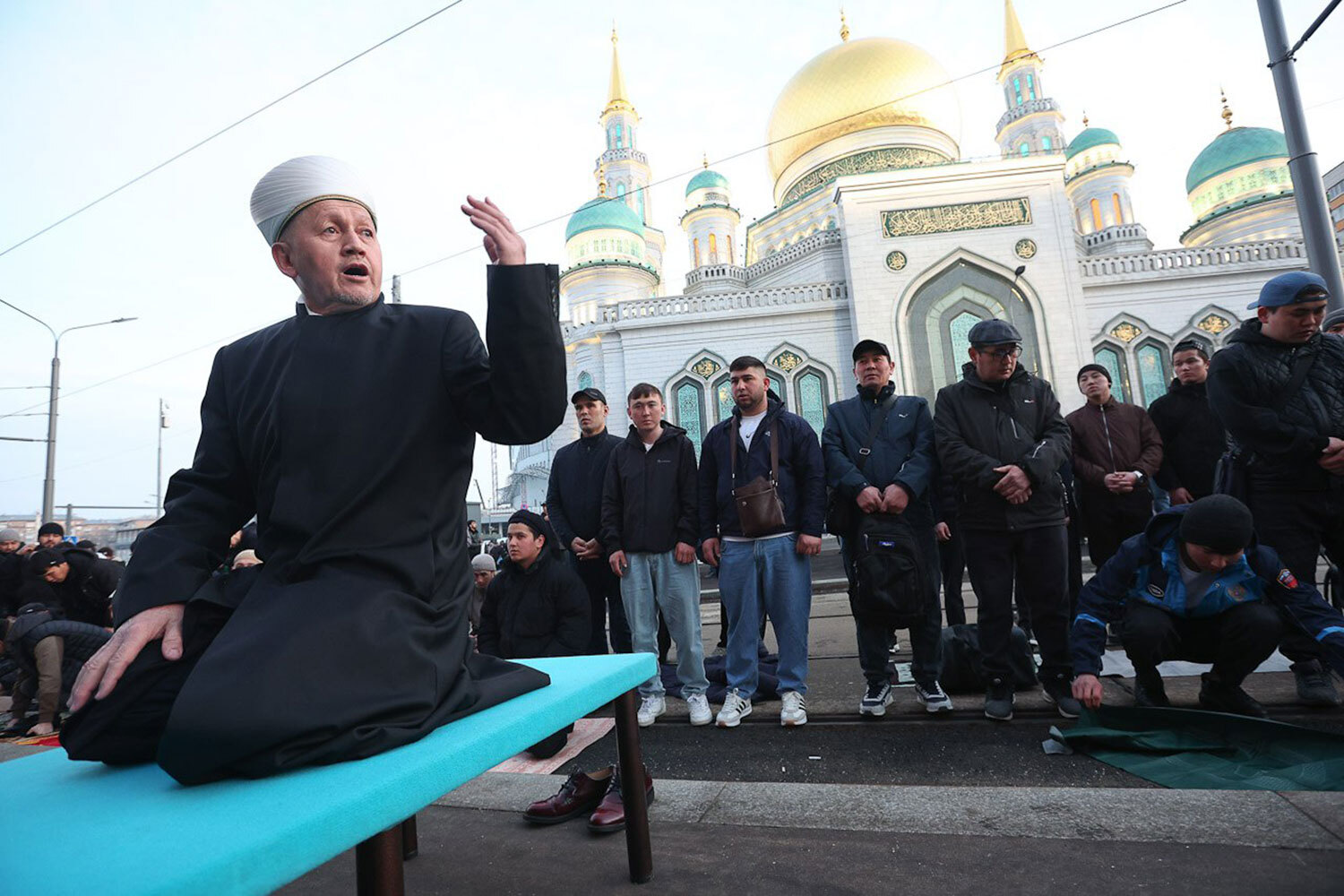 20 марта 2026 г. Имам Московской Соборной мечети Марат хазрат Аршабаев во время торжественного намаза по случаю праздника Ураза-байрам у Соборной мечети в Москве.