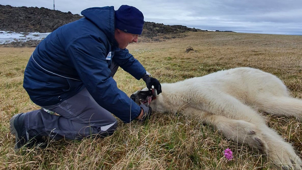В Диксоне ветеринары спасли медведя с застрявшей в пасти банкой