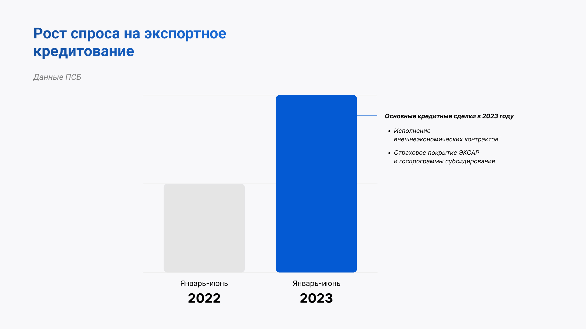 В целях наращивания объемов экспорта продукции агропромышленного комплекса сельхозпроизводители тоже могут рассчитывать на господдержку. Им доступны льготные оборотные кредиты на срок до 1 года и инвесткредиты — от 2 до 15 лет при условии наличия заключенного соглашения о повышении конкурентоспособности. Банки стремятся сделать работу с «экспортными» финансовыми продуктами удобнее с помощью цифровых инструментов. В случае с ПСБ работает система PSB Corporate (18+). Она обеспечивает дистанционное оформление документов, ускоряя взаимодействие клиента с банком.