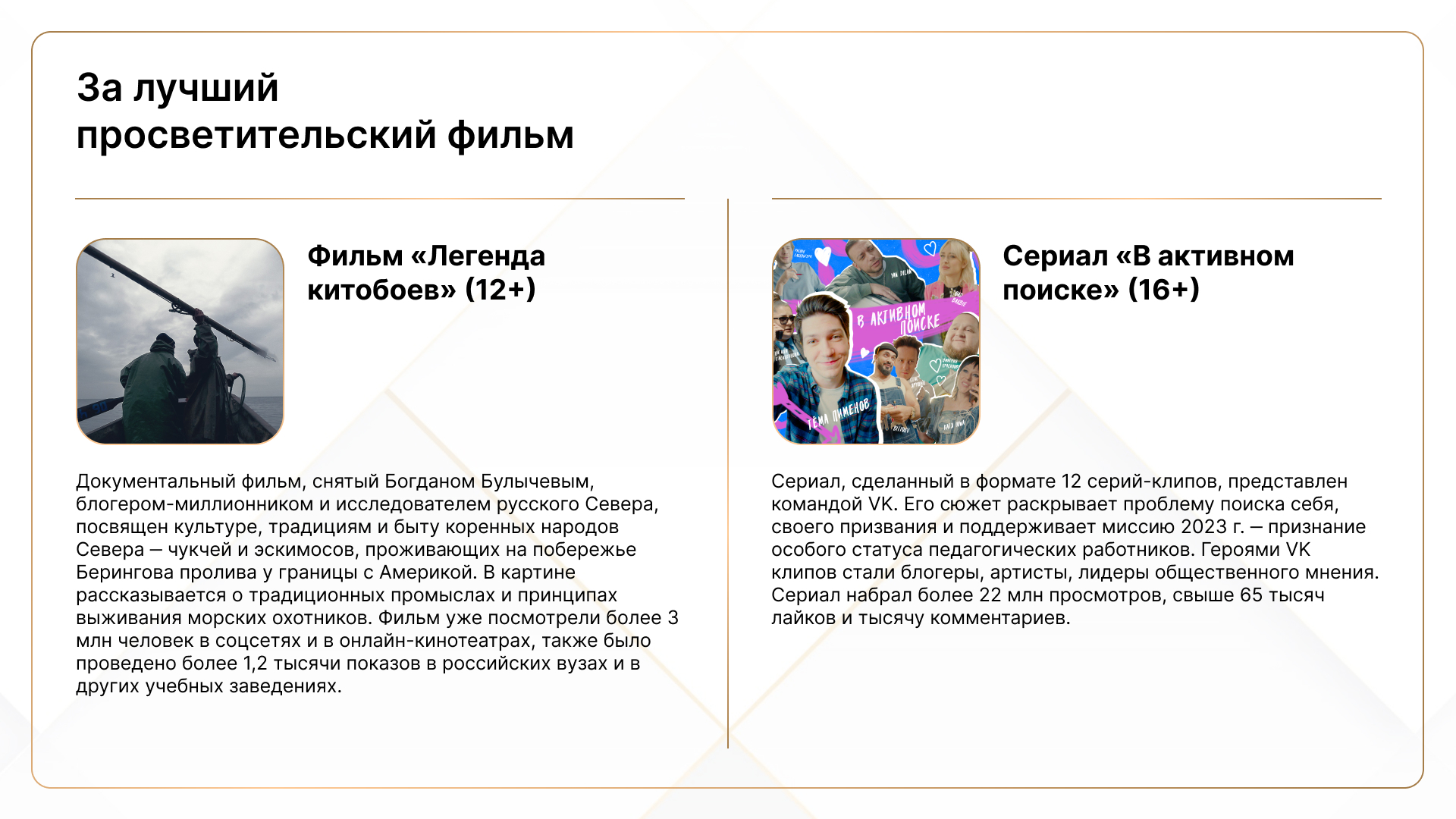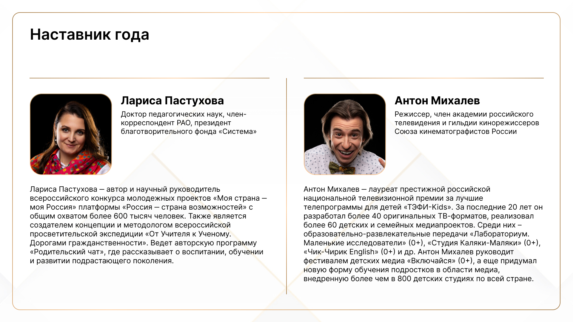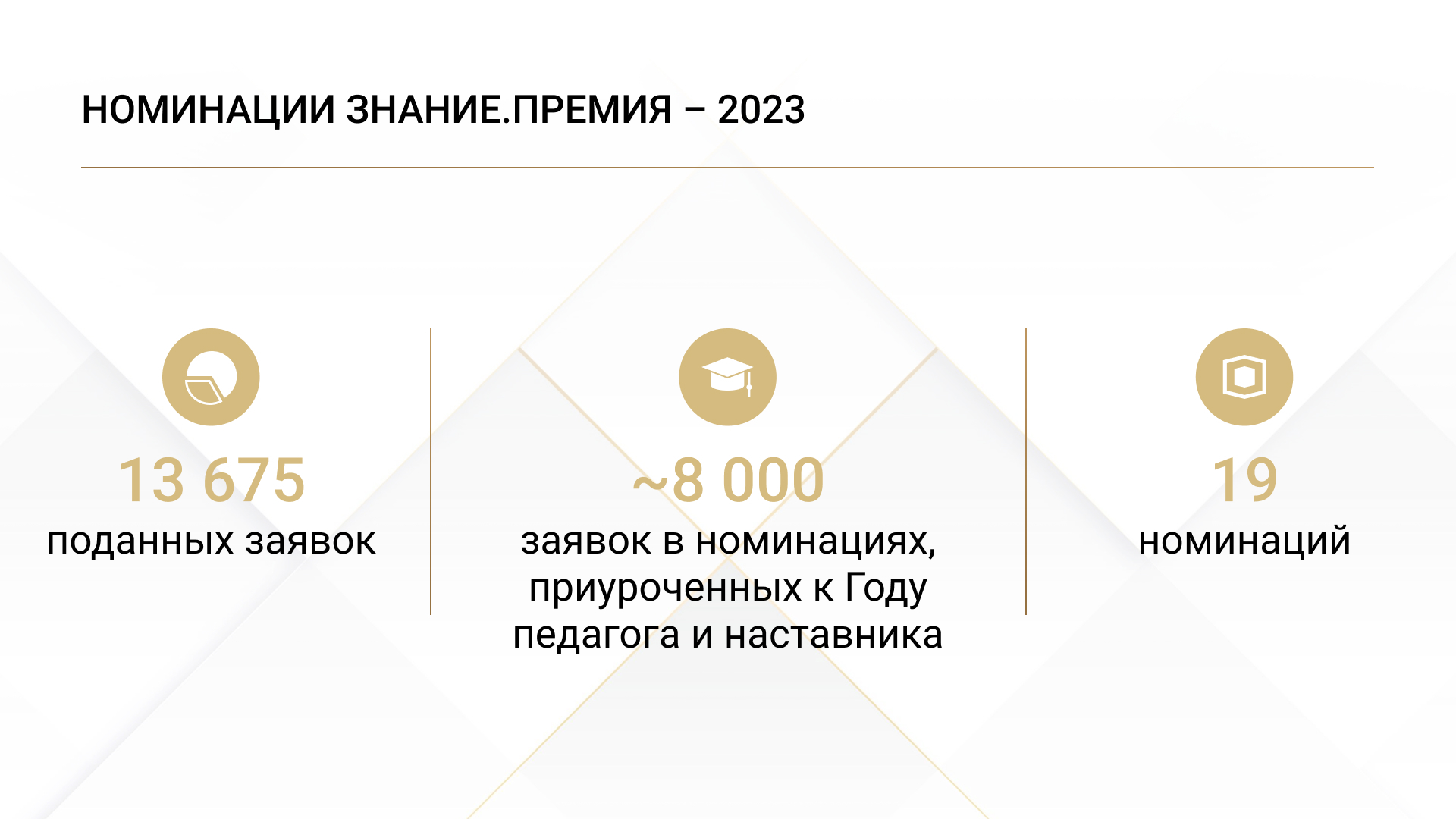 Самыми популярными номинациями оказались те, что приурочены к Году педагога и наставника в России, объявленному указом Президента РФ: «За просветительскую деятельность в школе», «Наставник года», «За просветительскую деятельность в системе среднего профессионального образования», «За просветительскую деятельность в университете». Именно на участие в этих номинациях было подано больше всего заявок – более 8 тысяч.