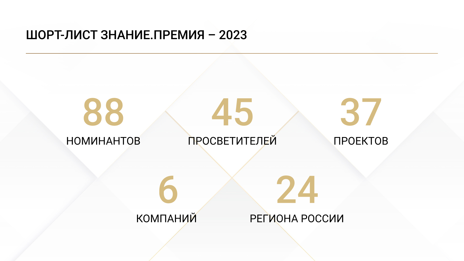 После проверки Экспертной комиссией кандидатов в шорт-лист отбирал Экспертный совет. В него вошли более сотни авторитетных специалистов: ректоры, дипломаты, представители корпораций, чиновники. Они отобрали 88 номинантов: 45 просветителей и 37 проектов из 24 регионов России, а также 6 компаний. Конкурс на попадание в шорт-лист был серьезный – более 150 человек на место.