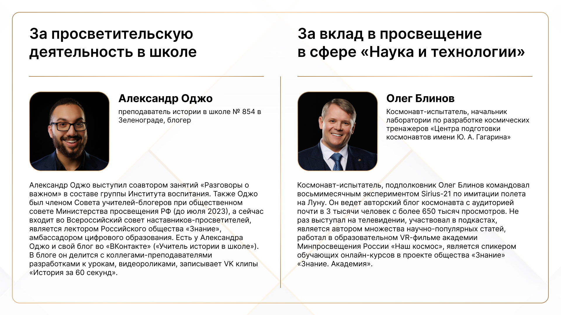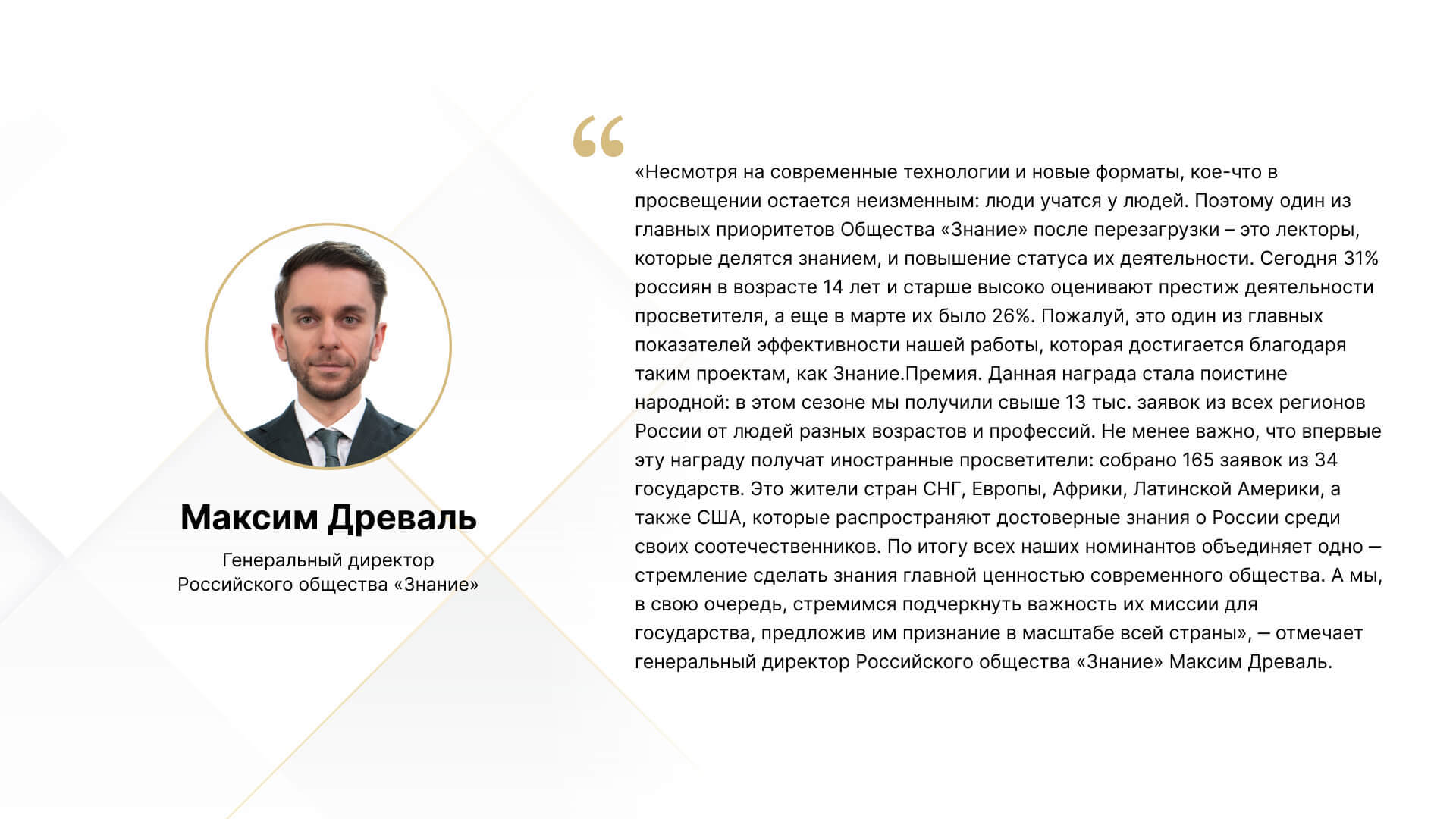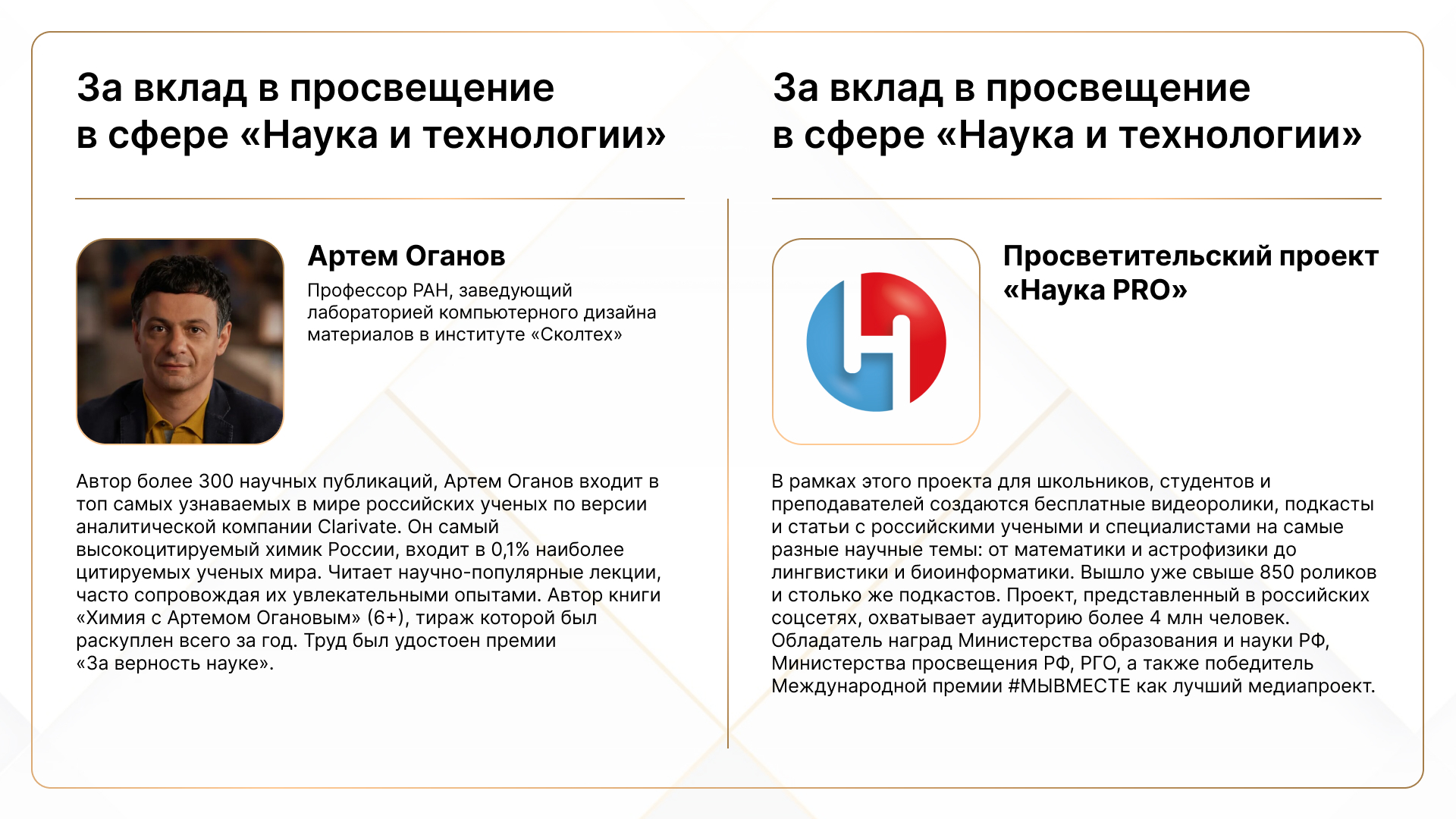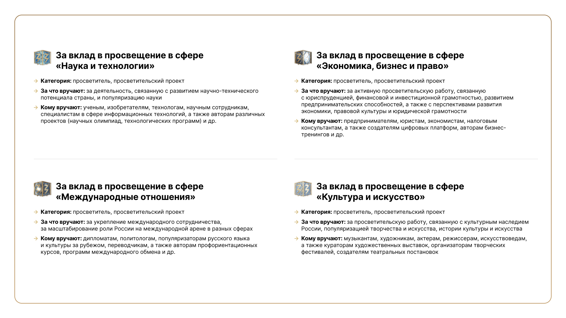 Эксперты, распространяющие и популяризирующие знание, пишущие книги, снимающие фильмы, создающие профориентационные и развивающие курсы, преподающие в школах и вузах, безусловно, нуждаются в поддержке и заслуживают наград. С целью признать достижения деятелей науки, искусства, спорта, историков, литераторов, политологов, психологов и других деятелей просвещения, отметить их проекты и была придумана специальная премия.