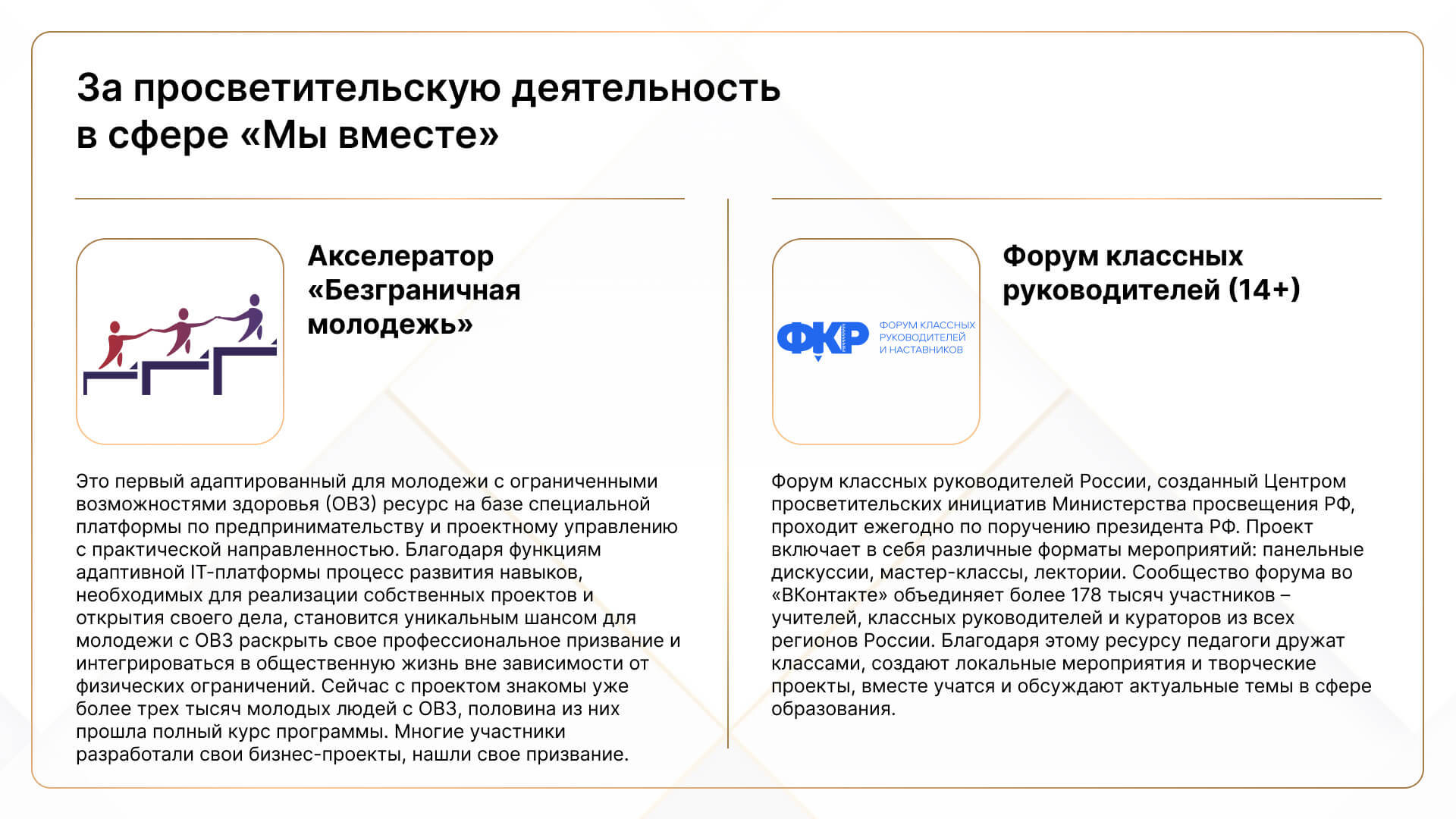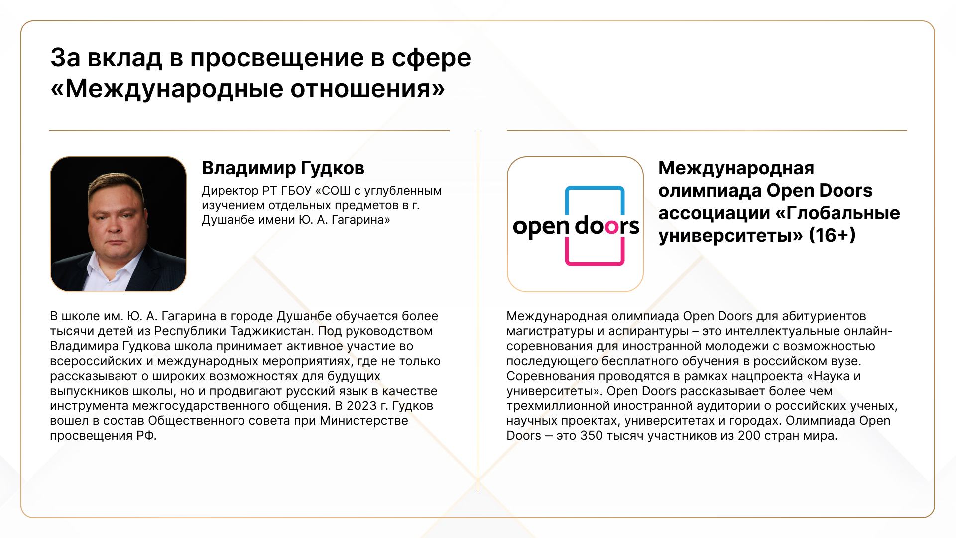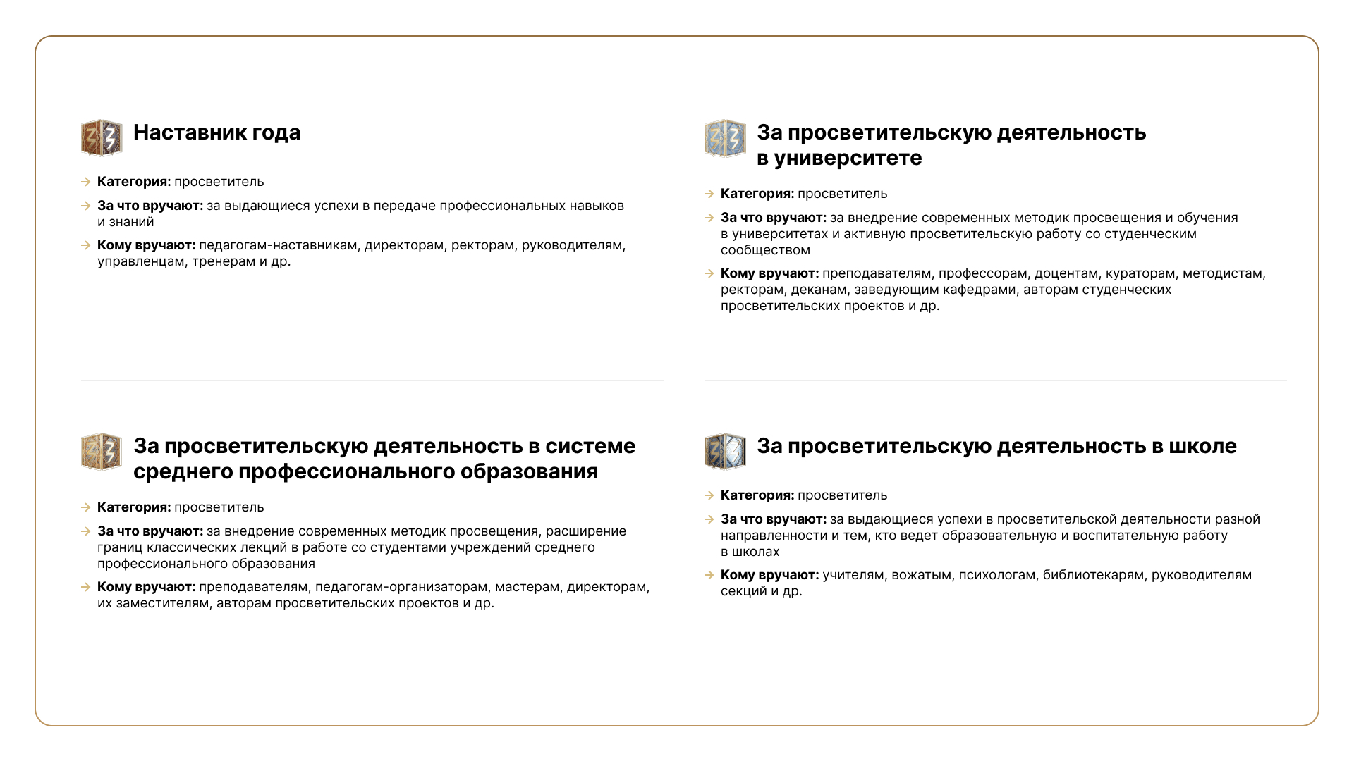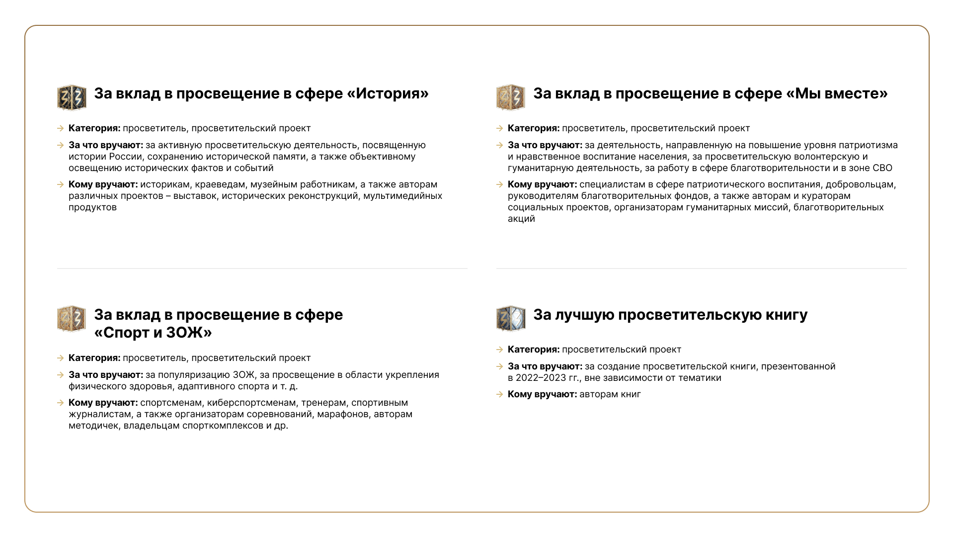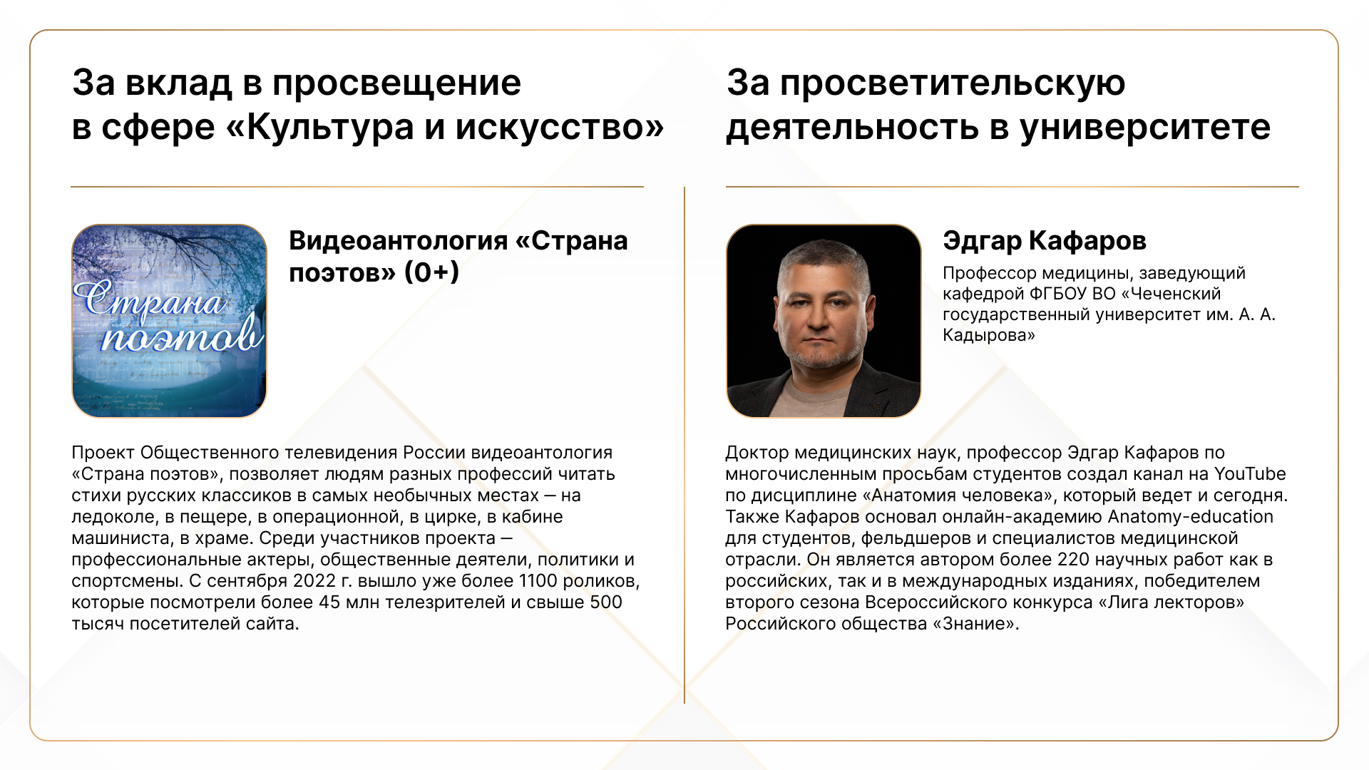 Эксперты, распространяющие и популяризирующие знание, пишущие книги, снимающие фильмы, создающие профориентационные и развивающие курсы, преподающие в школах и вузах, безусловно, нуждаются в поддержке и заслуживают наград. С целью признать достижения деятелей науки, искусства, спорта, историков, литераторов, политологов, психологов и других деятелей просвещения, отметить их проекты и была придумана специальная премия.