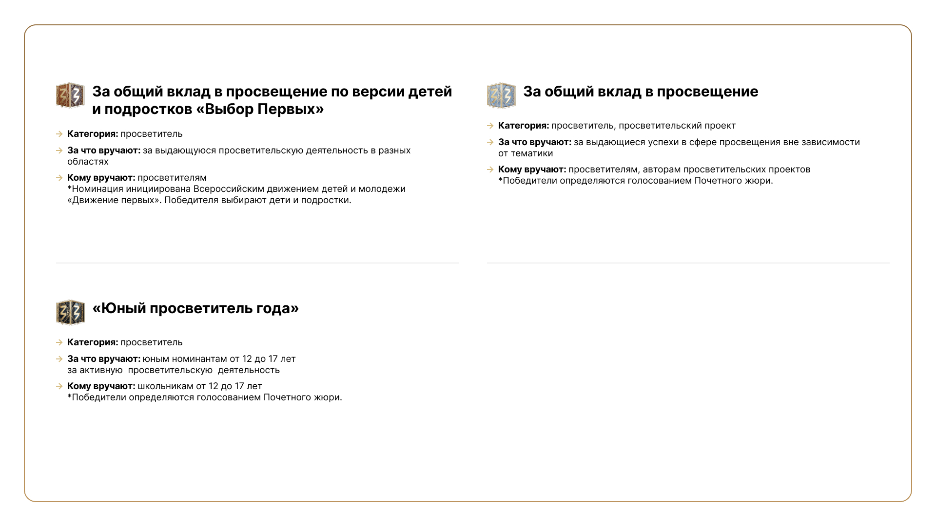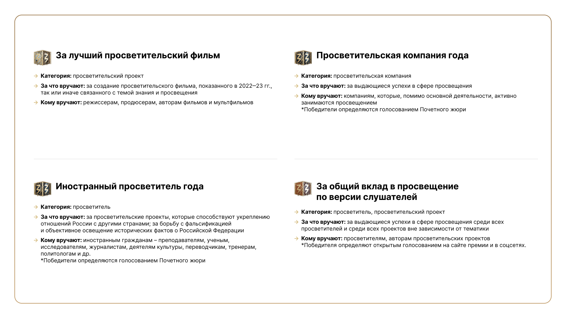 В прошлом году у премии было 13 номинаций, а в этом – 19. Каждая номинация вручается в разных категориях («просветитель», «просветительский проект» или «просветительская компания»).