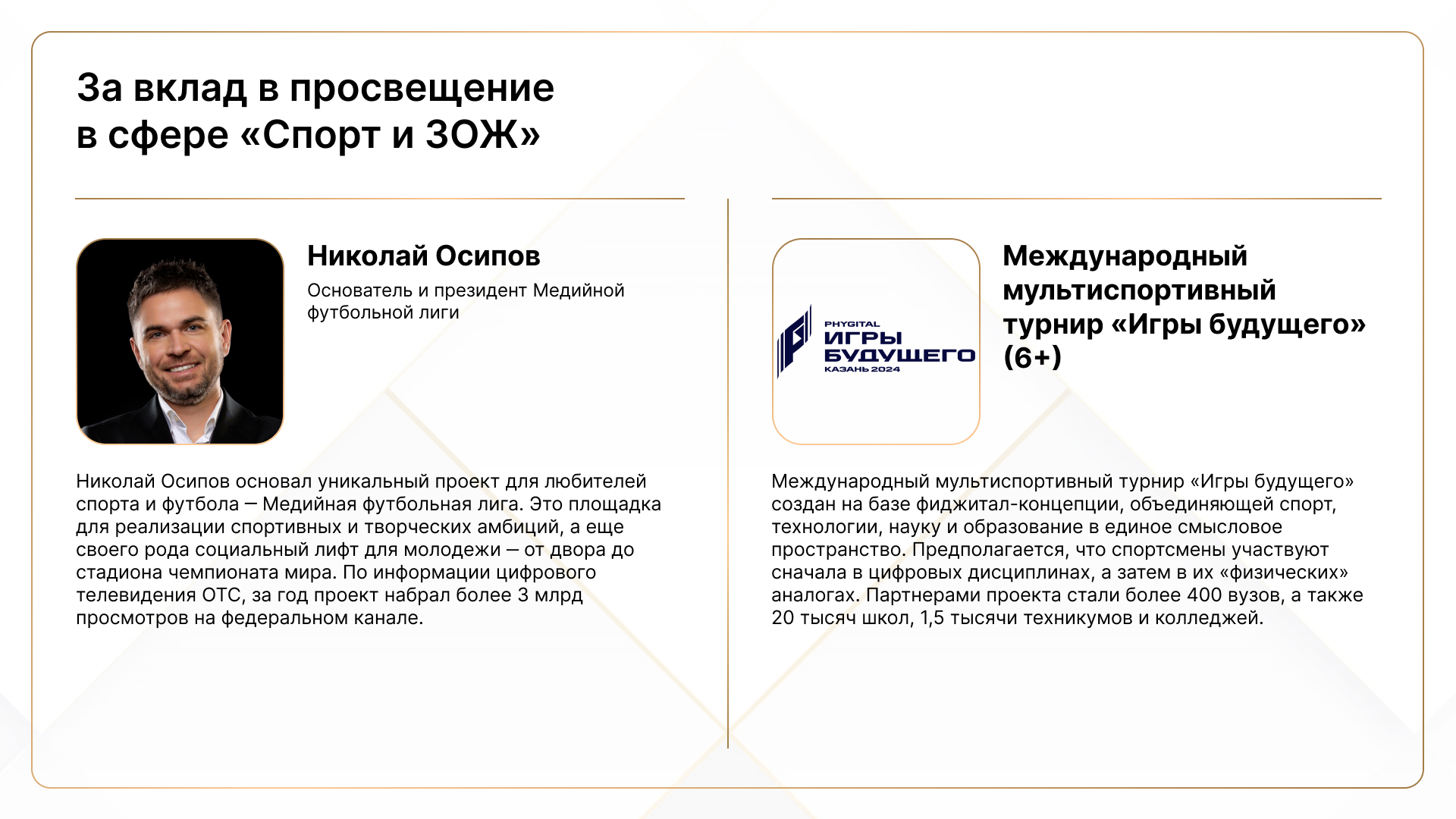 В 2023 г. у премии появились новые номинации, например связанные с вкладом в просвещение в сфере спорта и ЗОЖ. К номинации в области экономики и бизнеса в этом году добавили право.