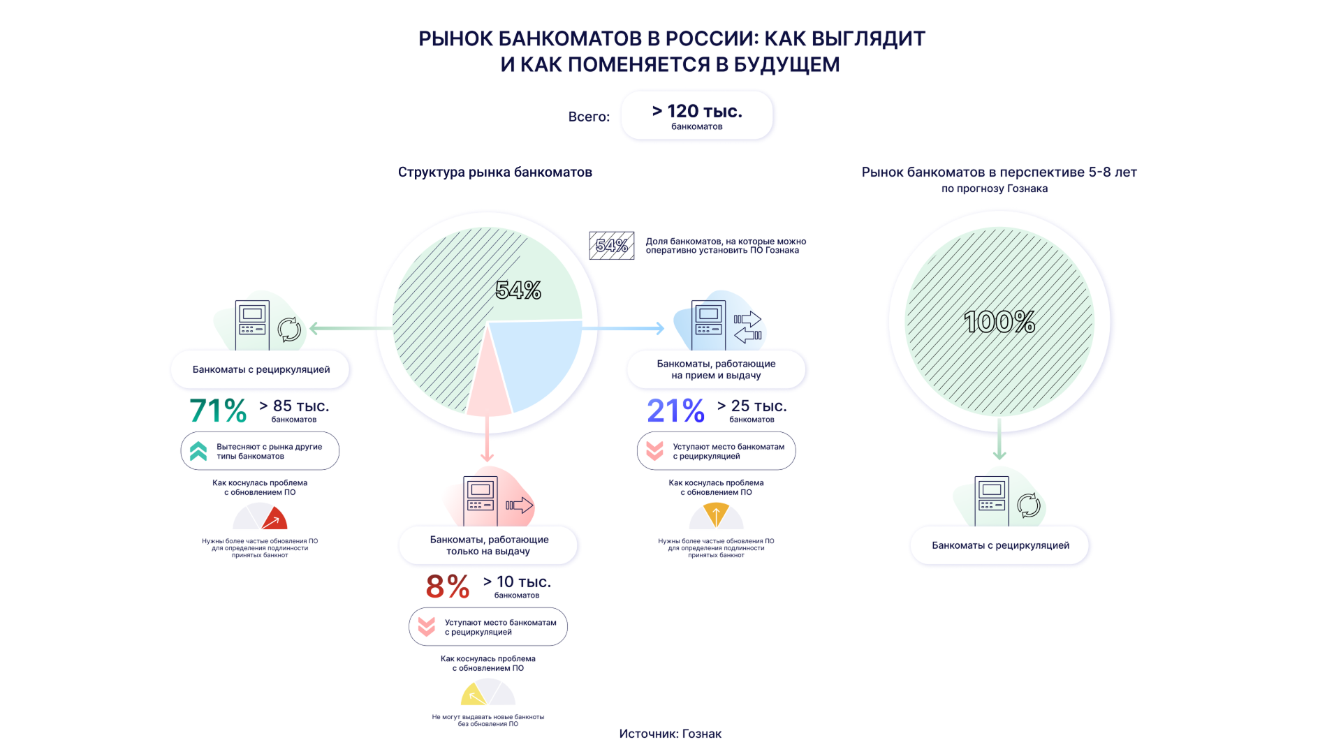 ● Доля банкоматов с рециркуляцией на рынке планомерно растет. По прогнозам Гознака, в перспективе 5–8 лет количество таких моделей должно приблизиться к 100%. Все они будут совместимы с новым ПО.