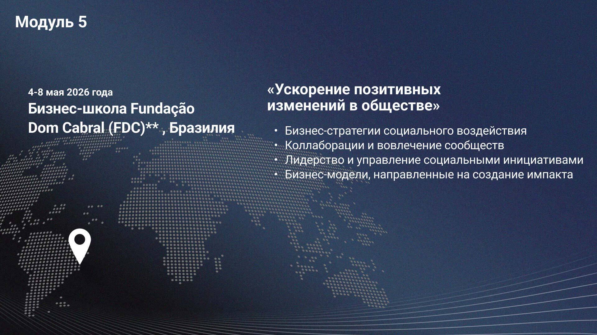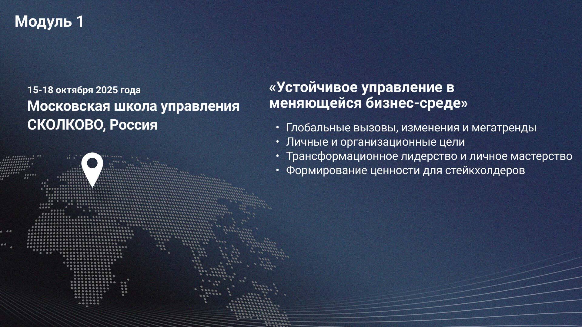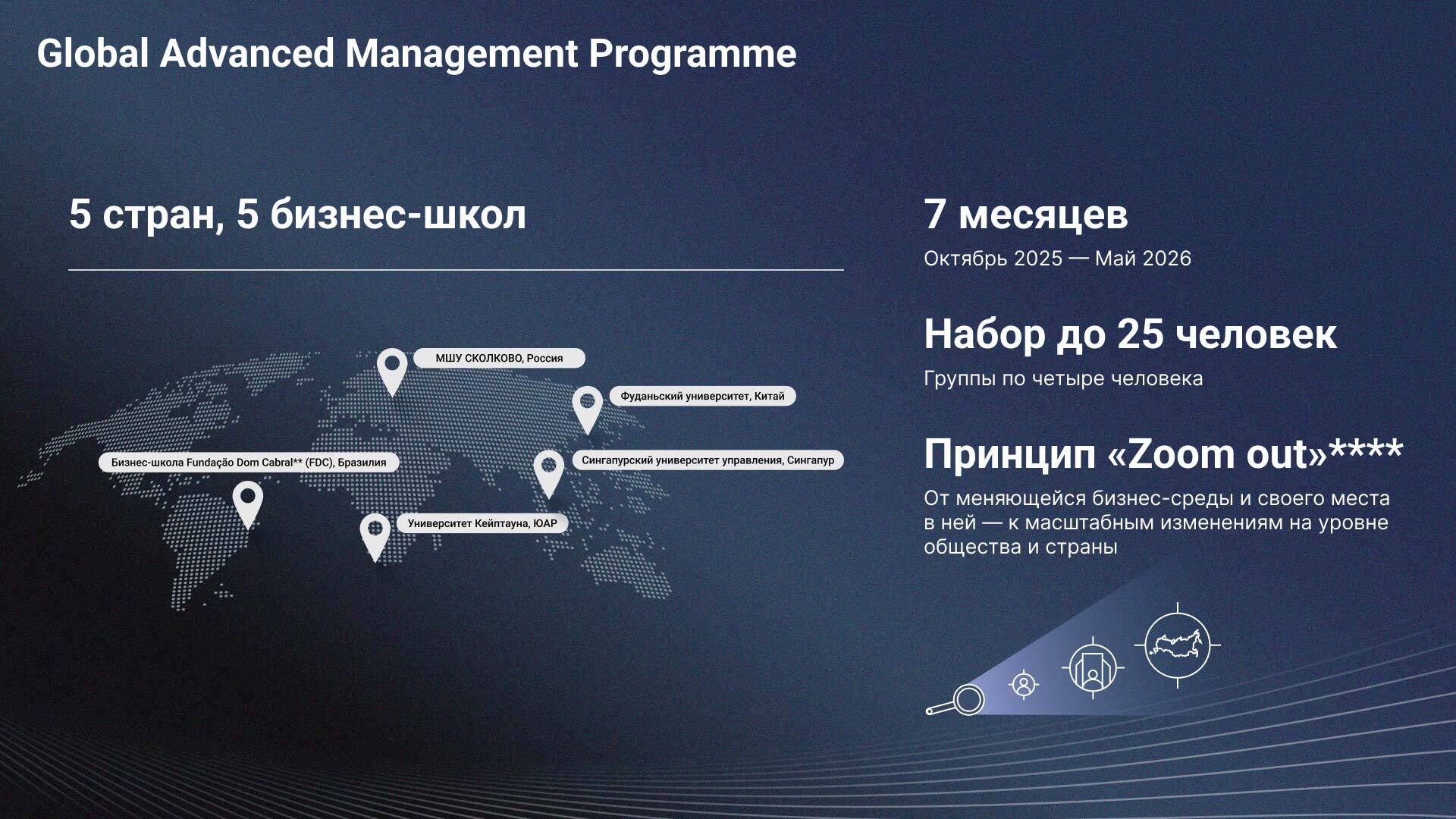 Программа Global Advanced Management Programme (Московской школы управления СКОЛКОВО)* создана с фокусом на глобальный мультикультурный контекст и соприкосновение личного опыта с культурами и бизнес-практиками стран Глобального Юга и не только. Она включает в себя пять модулей в пяти странах, где обучение*** проводится в сотрудничестве с топовыми бизнес-школами и университетами, выдающимися академиками, исследователями, предпринимателями и государственными деятелями. Программа спроектирована так, что образовательные модули дополняются сквозным лидерским треком и иммерсивным опытом погружения в социокультурную и бизнес-экосистему других стран.