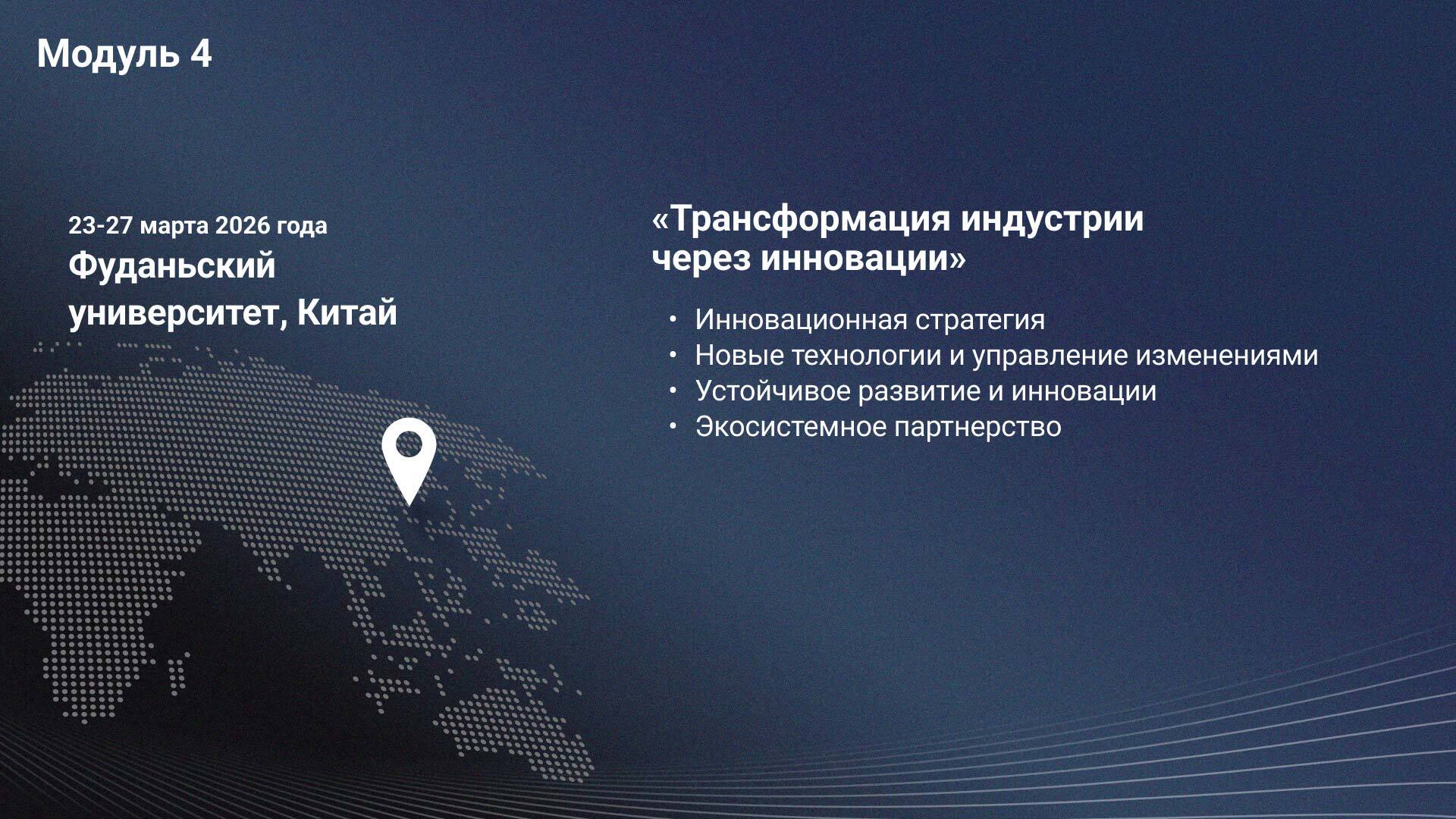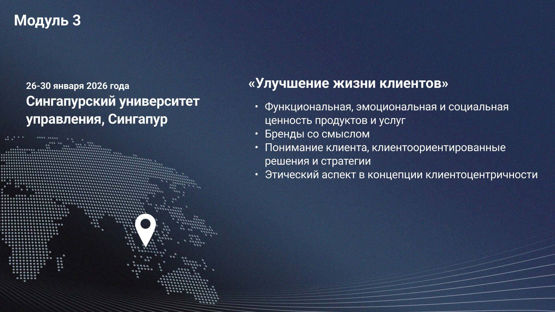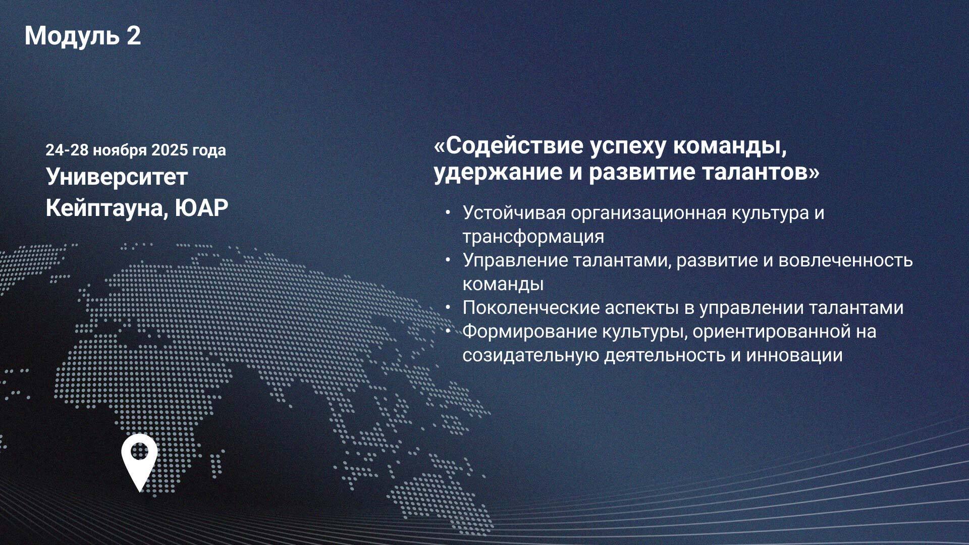 Программа Global Advanced Management Programme (Московской школы управления СКОЛКОВО)* создана с фокусом на глобальный мультикультурный контекст и соприкосновение личного опыта с культурами и бизнес-практиками стран Глобального Юга и не только. Она включает в себя пять модулей в пяти странах, где обучение*** проводится в сотрудничестве с топовыми бизнес-школами и университетами, выдающимися академиками, исследователями, предпринимателями и государственными деятелями. Программа спроектирована так, что образовательные модули дополняются сквозным лидерским треком и иммерсивным опытом погружения в социокультурную и бизнес-экосистему других стран.