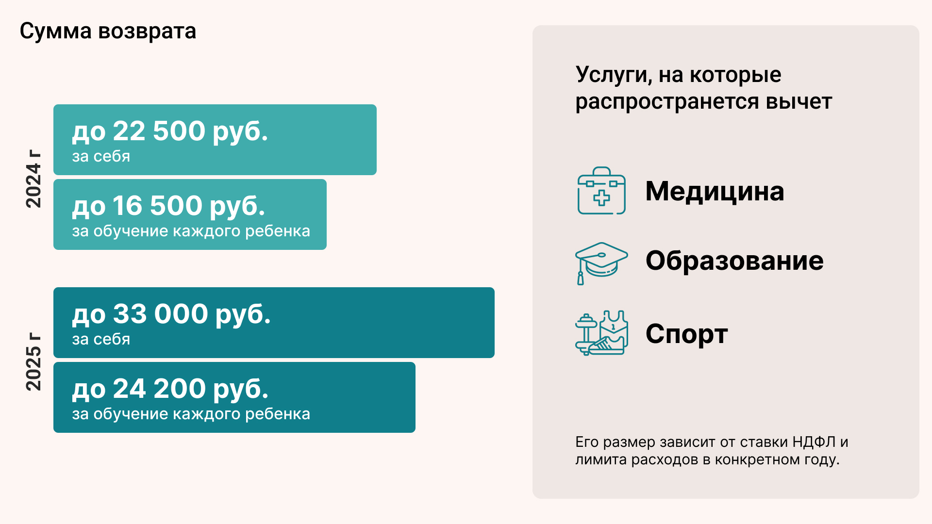 Вычет распространяется на медицинские, образовательные, спортивные услуги. Его размер зависит от ставки НДФЛ и лимита расходов в конкретном году. Так, по итогам 2024 г. россияне могут вернуть до 22 500 руб. за себя и до 16 500 руб. за обучение каждого ребенка, а по итогам 2025 г. − до 33 000 руб. и до 24 200 руб. соответственно. Исключением является вычет по дорогостоящему лечению, по нему не установлен лимит, а сумма вычета рассчитывается от суммы фактических расходов.