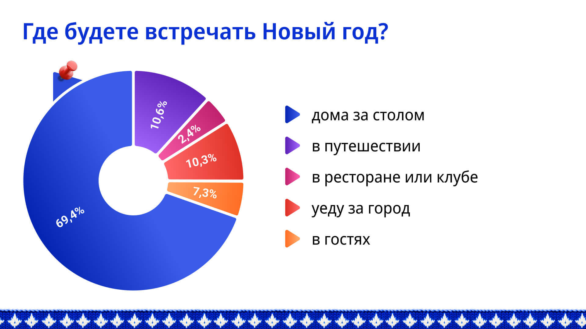 Большинство участников исследования (69,3%) выбрали встречать этот Новый год дома. Лишь каждый пятый респондент планирует отправиться в путешествие.