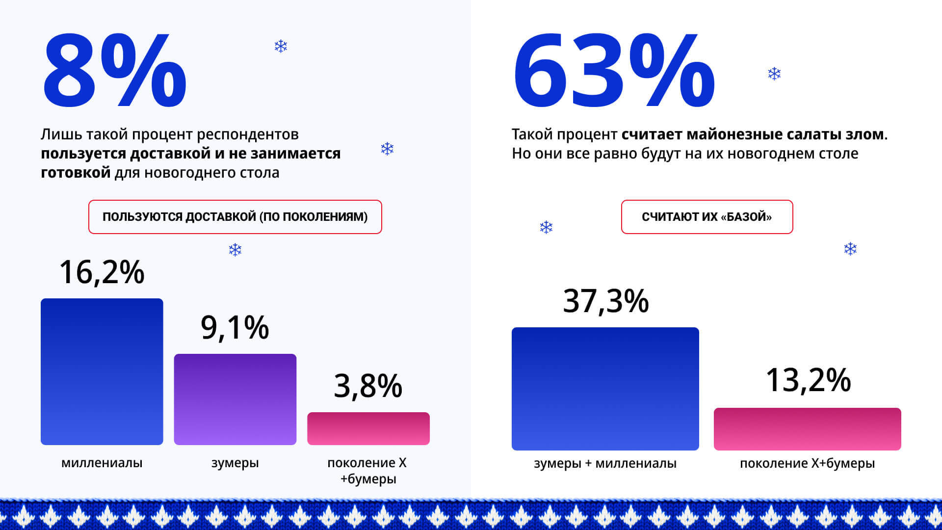 При этом самые ленивые повара – миллениалы. 16,2% из них привязаны к сервисам доставки настолько, что воспользуются ими и в канун Нового года. Среди зумеров таких 9,1%, а среди людей старше 45 – всего 3,8%.