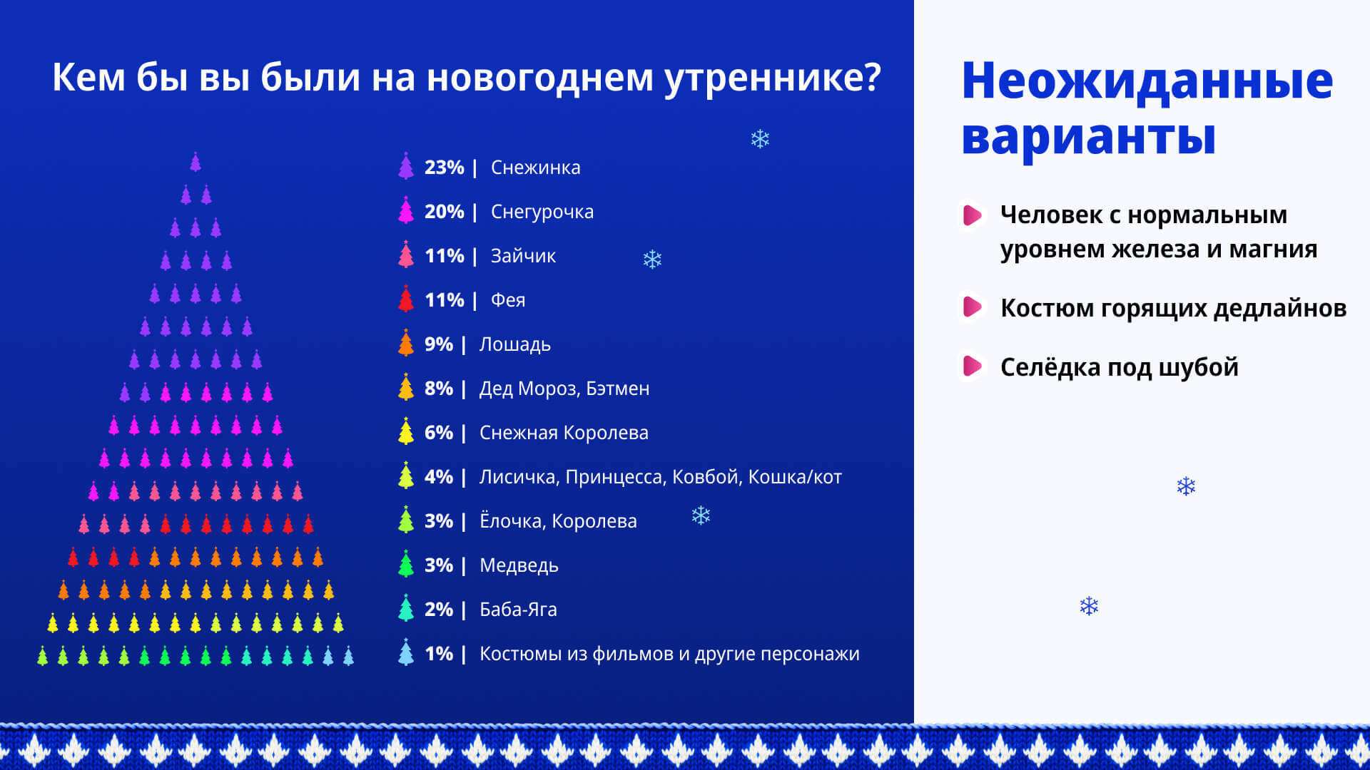 Барабанная дробь… Снежинки! Именно она обошла ещё одну классику новогодних утренников и ёлок – Снегурочку – и стала самым популярным костюмом из детства. Чувства юмора респондентам тоже не занимать, кто-то хотел бы примерить образ «человека с нормальным уровнем железа и магния», наряд «горящих дедлайнов» или «селедки под шубой».
