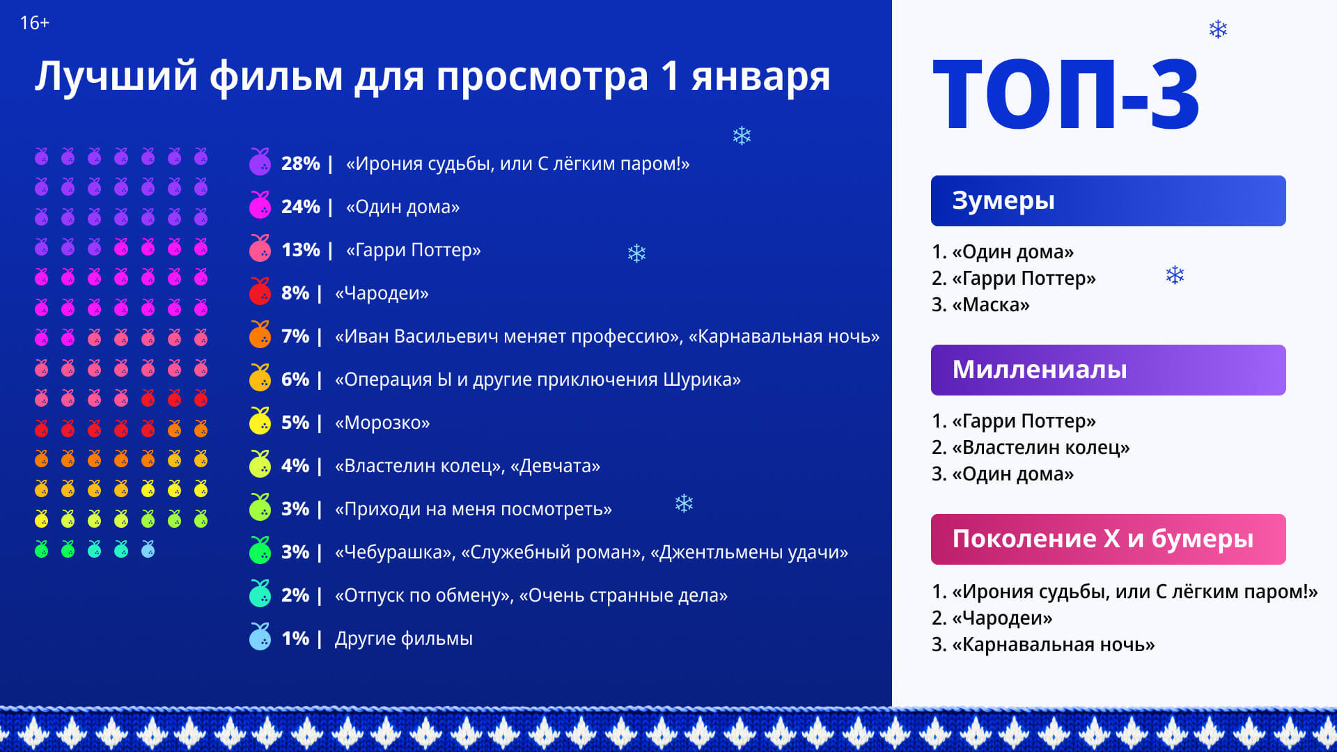 И здесь победа «Иронии судьбы», в последний момент обогнавшей «Один дома», не должна вводить в заблуждение, ведь распределение по возрастным группам оказалось принципиально разным. У зумеров список возглавили «Гарри Поттер» и «Один дома» (хотя и советская новогодняя киноклассика им оказалась совершенно не чуждой: «Иван Васильевич меняет профессию» вошел в топ-4). У миллениалов к лидерам присоединяется франшиза «Властелин колец».