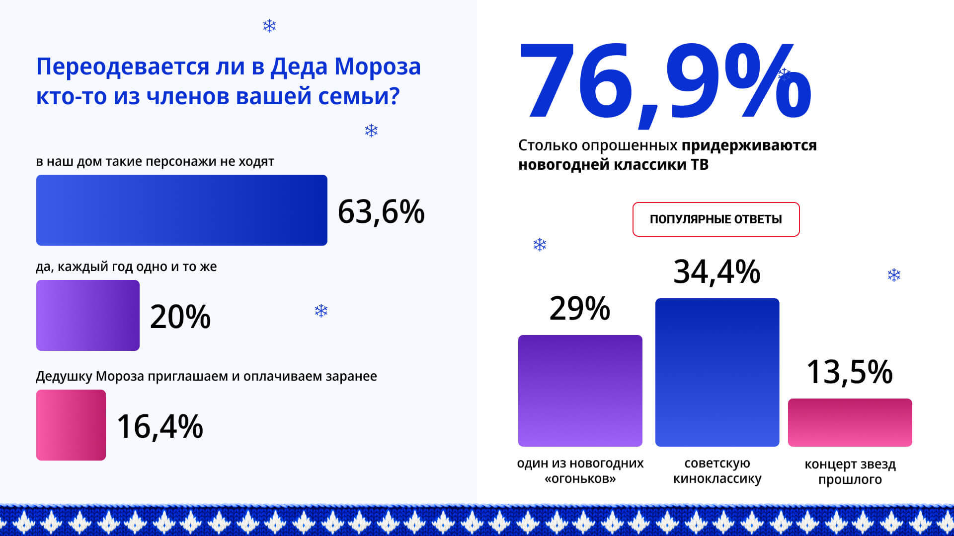 И еще к вопросу о ностальгии: почти 77% опрошенных включат телевизор вечером 31-го: будут выбирать между советскими фильмами (34,4%), «Голубым огоньком» (29%) или концертом ретрозвезд (13,5%). Но стоит отметить, что появляются и новые традиции, особенно когда речь идет про то, какой фильм включить первого января.