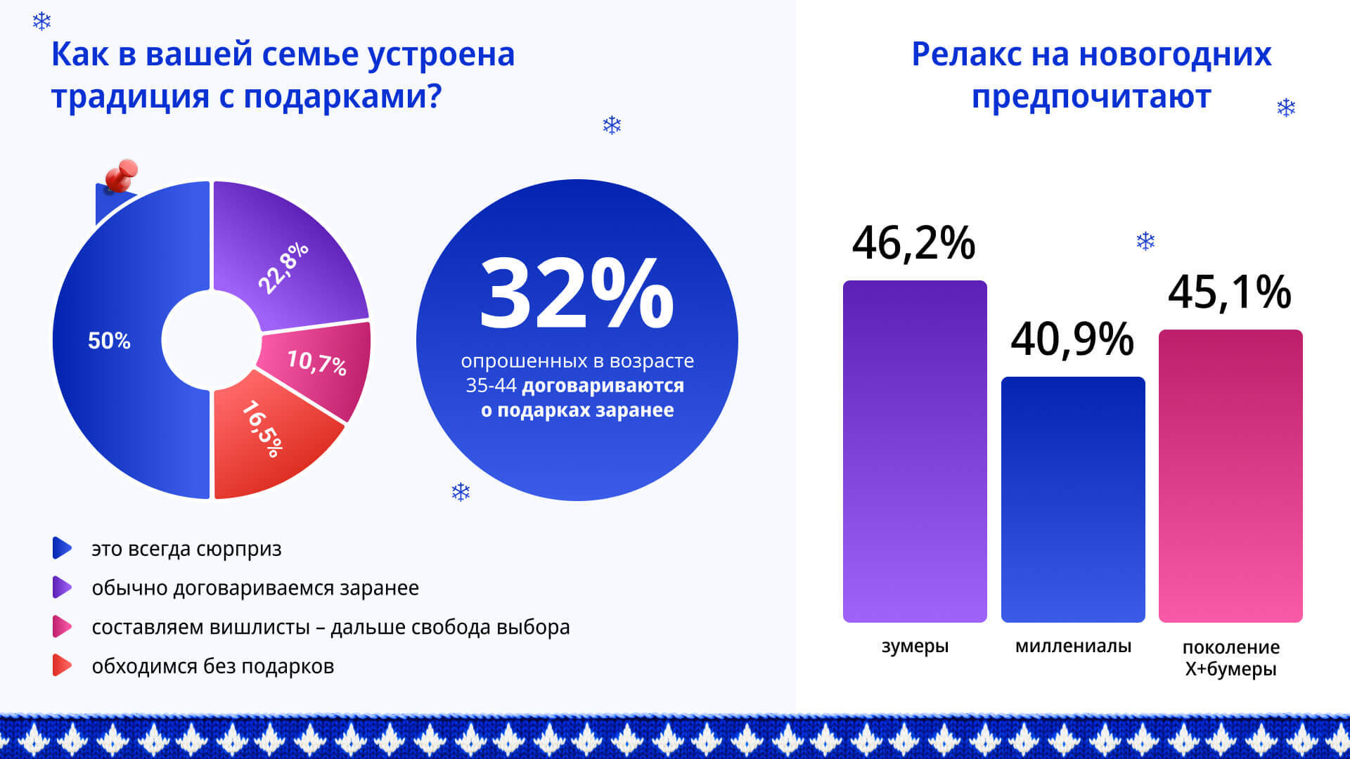 Современный формат – списки желаний с подборкой вариантов на разный вкус и бюджет – балансирует между сюрпризом и планом и пользуется популярностью у 10,7% дарителей. Особняком стоят 16,5% опрошенных, для которых главный подарок – это люди рядом, а материальные блага отходят на второй план. Ну или они просто экономные – решать вам.