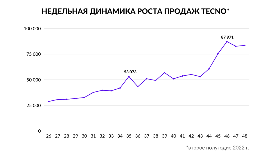 Такой подход позволил TECNO продвинуться и прочно закрепиться на российском рынке. По данным исследования аналитической компании Canalys, годовой рост продаж холдинга Transsion, ключевым брендом которого является TECNO, составил +1877%. Еще во втором квартале этого года TECNO вошел в список брендов с самой высокой динамикой продаж в штуках. По данным «Марвел-дистрибуции», продажи TECNO в мае-июне 2022 года выросли более чем в 20 раз в сравнении с аналогичным периодом 2021 года.