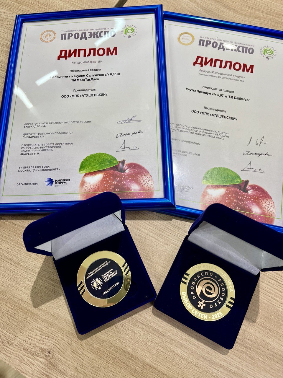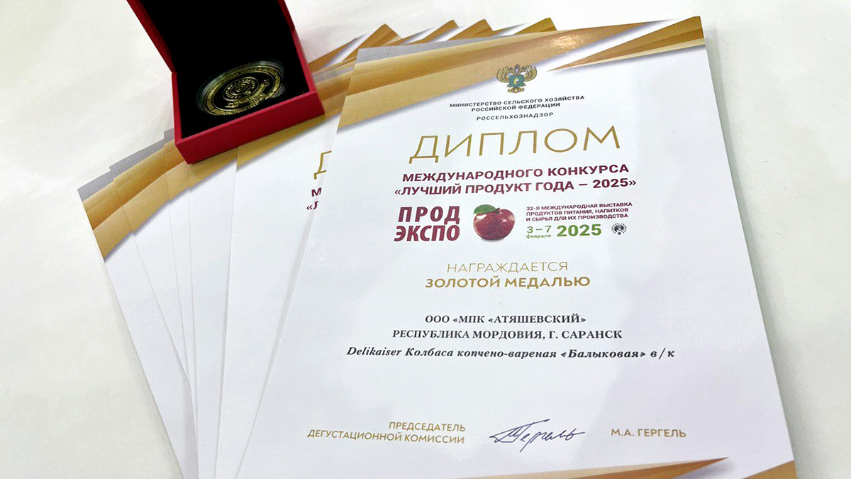 В рамках выставки компания участвовала сразу в нескольких отраслевых конкурсах: «Лучший продукт – 2025», «Продукты для ЗОЖ», «Выбор сетей». Неповторимый вкус и уникальная рецептура колбасных изделий, выпускаемых МПК «Атяшевский», не оставили равнодушными не только потребителей, но и экспертное сообщество. Продукция группы компаний была высоко оценена жюри и завоевала сразу несколько высших наград. Так, в конкурсе «Лучший продукт», золотую медаль получили: