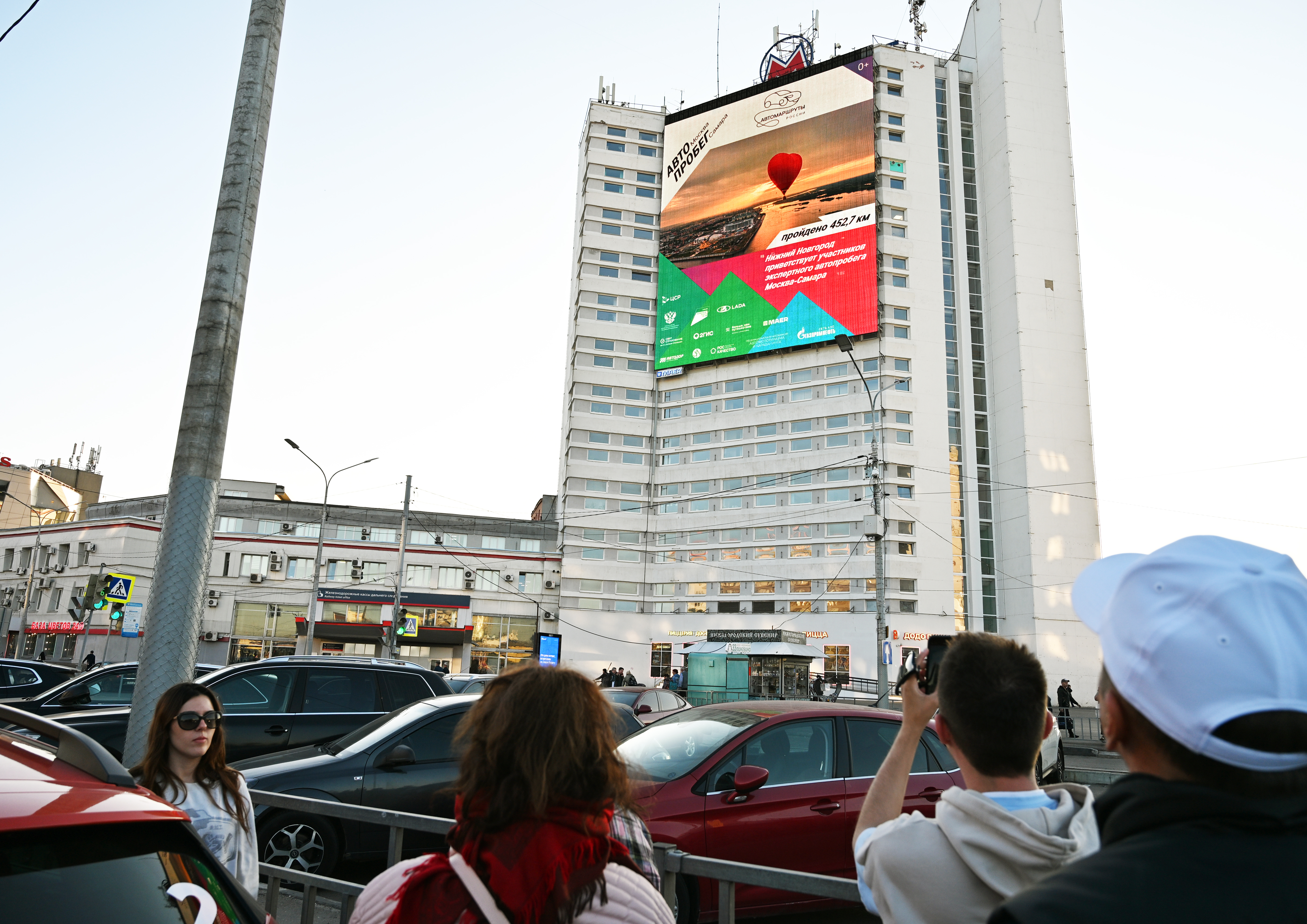 В Нижнем Новгороде участников встретил крупнейший медиафасад города с ярким приветствием. Это стало символичным началом серии городских встреч, которые будут сопровождать автопробег на всём маршруте.
