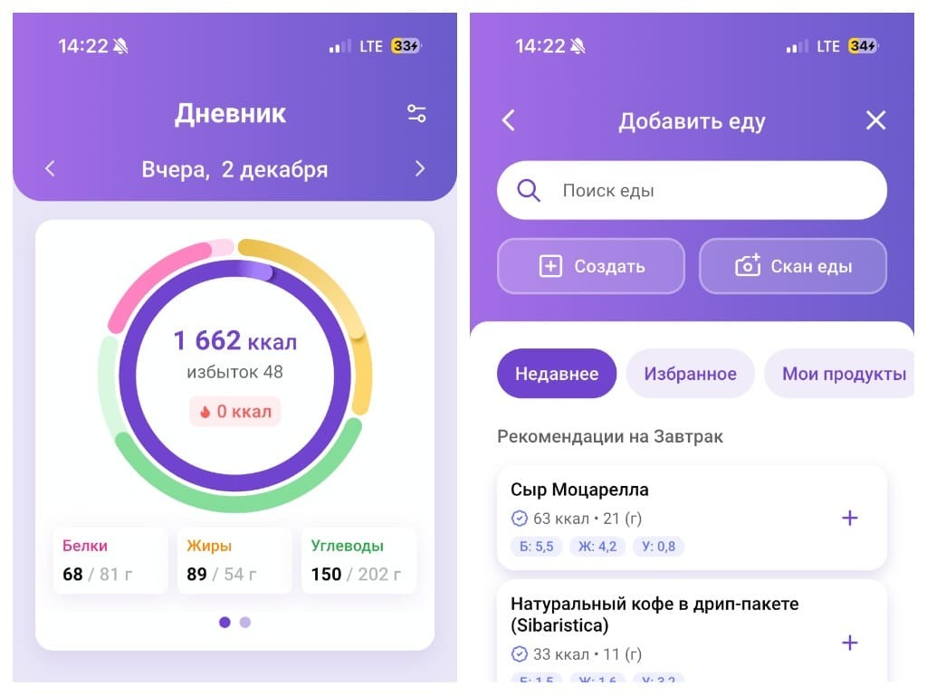 «Худеем Вместе» — одно из немногих приложений, где действительно ничего не прячут за платным доступом. Все, что обещано — от расчета калорий до анализа макронутриентов — доступно сразу после установки. Вы можете сфотографировать тарелку, и система в тот же момент предложит оценку энергетической ценности блюда. Не хотите полагаться на ИИ? Сканируйте штрих-код или читайте состав с этикетки — приложение распознает и то, и другое.