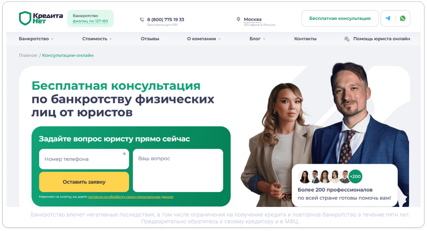 «КредитаНет» занимается только банкротством физлиц. Работает по всей России — есть офисы, но можно пройти всё дистанционно не выходя из дома. В команде — юристы, которые занимаются банкротством больше девяти лет, то есть стояли у истоков процедуры. Все завершённые дела можно проверить в открытых источниках. В штате больше 300 специалистов, и каждый день они проводят свыше 300 консультаций.