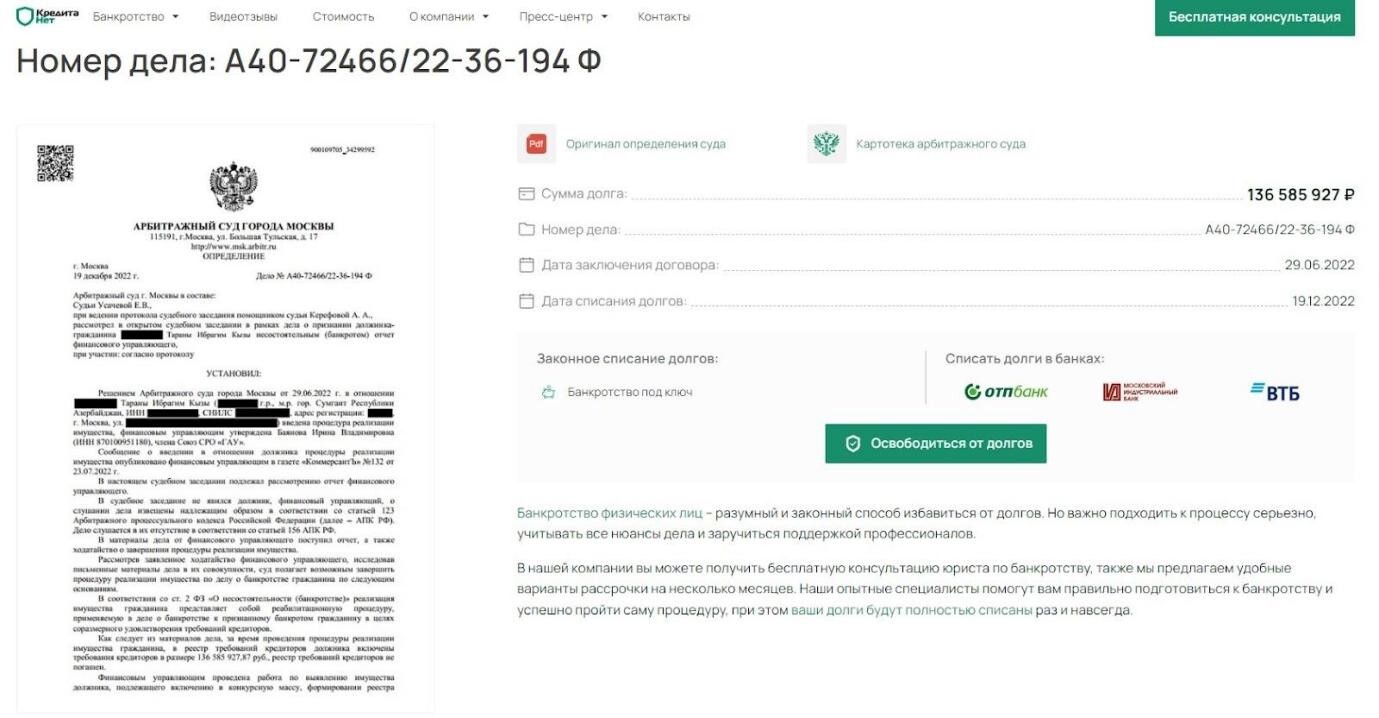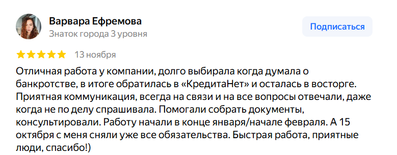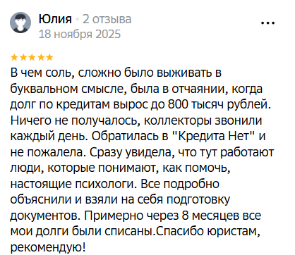 «КредитаНет» также выделяет скорость и результат. У компании есть свои рекорды. Например, самый крупный долг, который помогли списать юристы при помощи судебного банкротства, составляет 136 млн рублей. А самый короткий срок, за который удалось завершить процедуру, — 4 месяца.