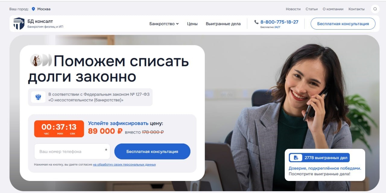 Основа подхода этой компании — детальный анализ на старте. На бесплатной консультации юрист изучает вашу кредитную историю и составляет пошаговый план. Специалисты фирмы берут на себя всё: от сбора документов до защиты в суде и разработки стратегии по сохранению имущества.