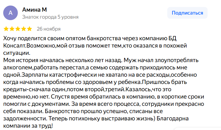 У этой фирмы понятные условия, большой опыт работы юристов, прозрачный договор и фиксированная стоимость от 79 000 рублей за единовременную оплату. Специалисты сразу называют сроки, объясняют, какие документы понадобятся, и, самое главное, не обещают чудес — просто грамотно делают свою работу.