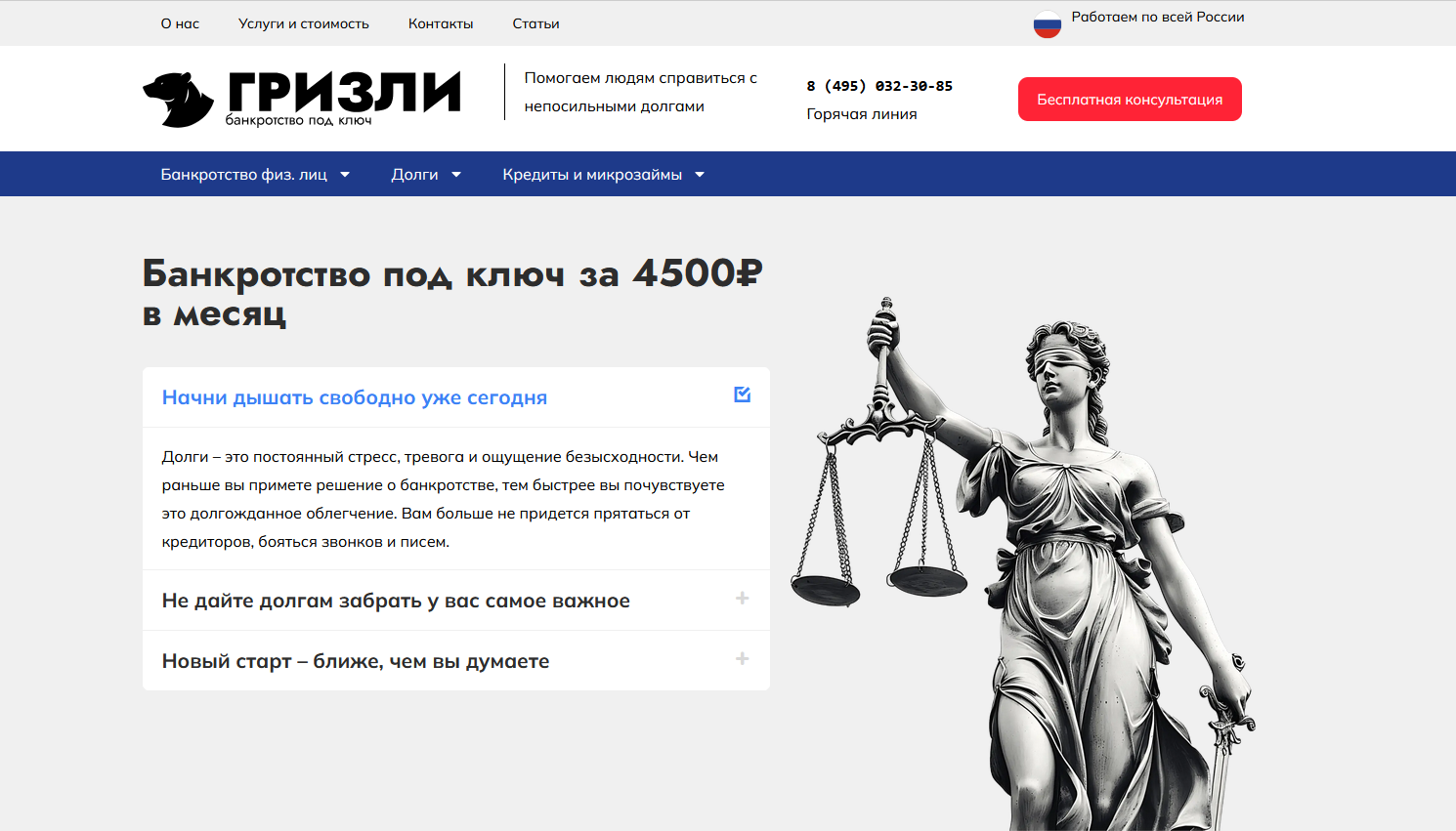 Следующая компания в нашем списке лучших фирм по банкротству физических лиц — «Гризли». Она работает по всей России и занимается сопровождением процедур исключительно под ключ. Здесь не предлагают отдельные услуги — специалисты сразу берут на себя весь процесс.