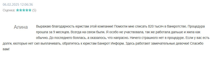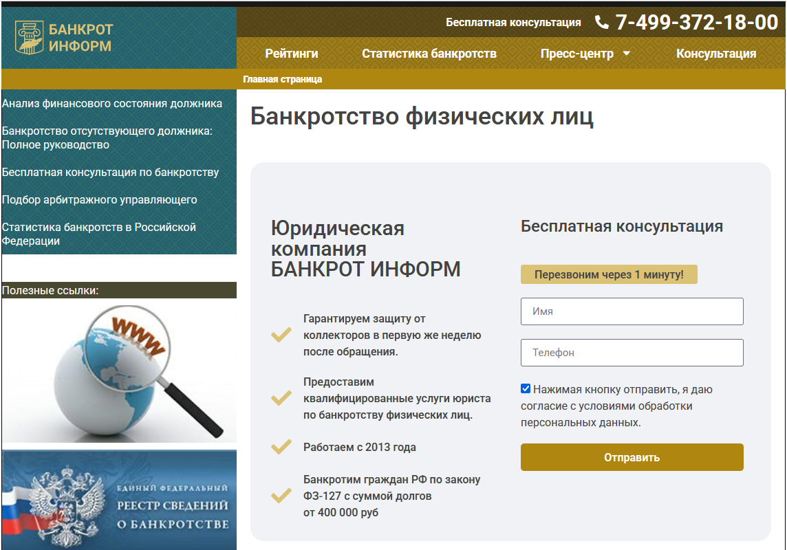 Компания «Банкрот Информ» на рынке юридических услуг с 2013 года. Её ключевая особенность — уже в первую неделю после обращения юристы организуют защиту от звонков коллекторов и кредиторов. «Банкрот Информ» работает с долгами от 400 000 рублей и обещает списать их в срок от 90 дней.