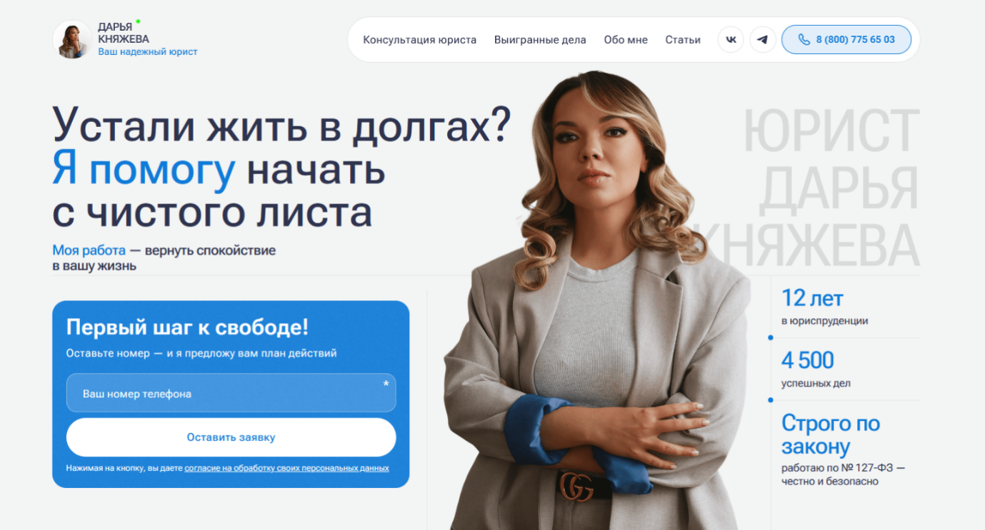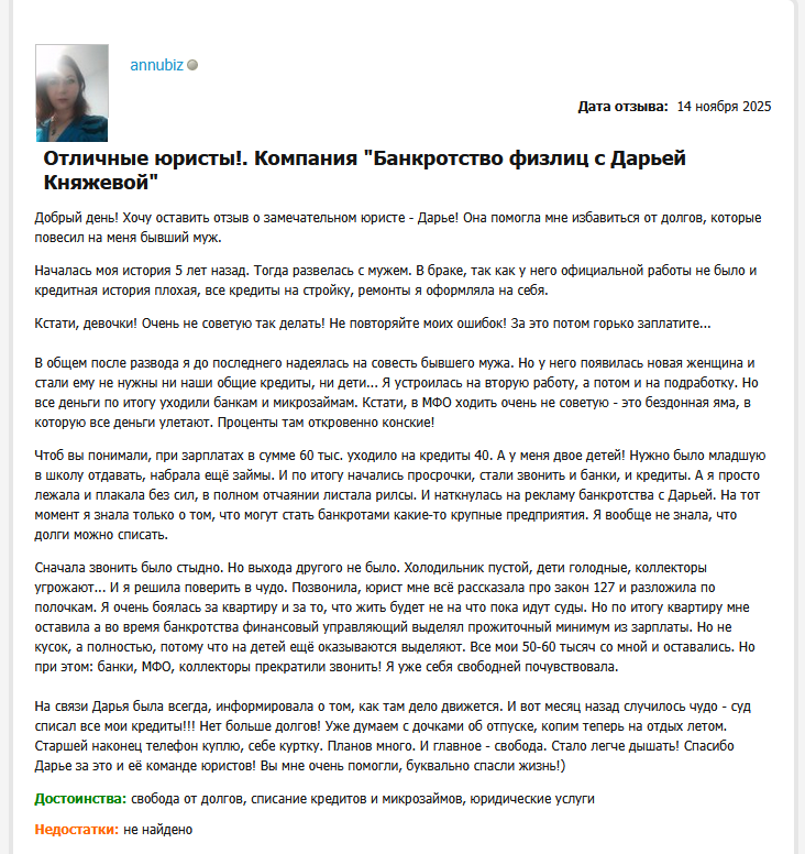 Подход Дарьи Княжевой — для тех, кто хочет, чтобы его ситуацию разбирал внимательный специалист. Бесплатная первичная консультация проходит максимально честно. Дарья сразу говорит, подходит ли вам банкротство или есть другие пути. Это шанс получить оценку от практика, который видит за цифрами реальные человеческие судьбы.
